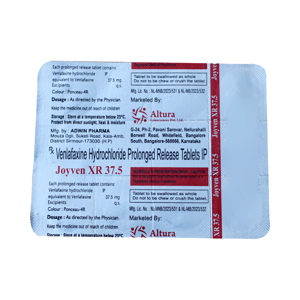 Joyven XR 37.5 Tablet is a medicine used to treat major depressive disorder and anxiety disorders. It helps improve mood, reduce nervousness, and improve overall well-being by restoring the balance of certain brain chemicals that affect mood and emotions. Joyven XR 37.5 Tablet should be taken with food. Take this medicine at the same time each day to maintain a stable level in your blood. If you miss a dose, take it as soon as you remember. Do not skip doses, and complete the full course of treatment even if you feel better. Do not stop taking this medication abruptly, as it may worsen your symptoms.Some common side effects of this medicine include nausea, insomnia (difficulty sleeping), constipation, increased sweating, and sexual dysfunction. However, these side effects are temporary and typically resolve on their own over time. Consult your doctor if these do not subside or bother you.Joyven XR 37.5 Tablet may cause dizziness and drowsiness, so avoid driving or engaging in activities that require mental focus until you understand how this medicine affects you. Before taking Joyven XR 37.5 Tablet, inform your doctor if you have any kidney, heart, or liver conditions or a history of seizures (epilepsy or fits). Additionally, notify your doctor if you experience any unusual mood or behavioral changes, worsening depression, or suicidal thoughts. Pregnant and breastfeeding women should consult before taking this medicine, as it may cause harmful effects on the developing baby.
