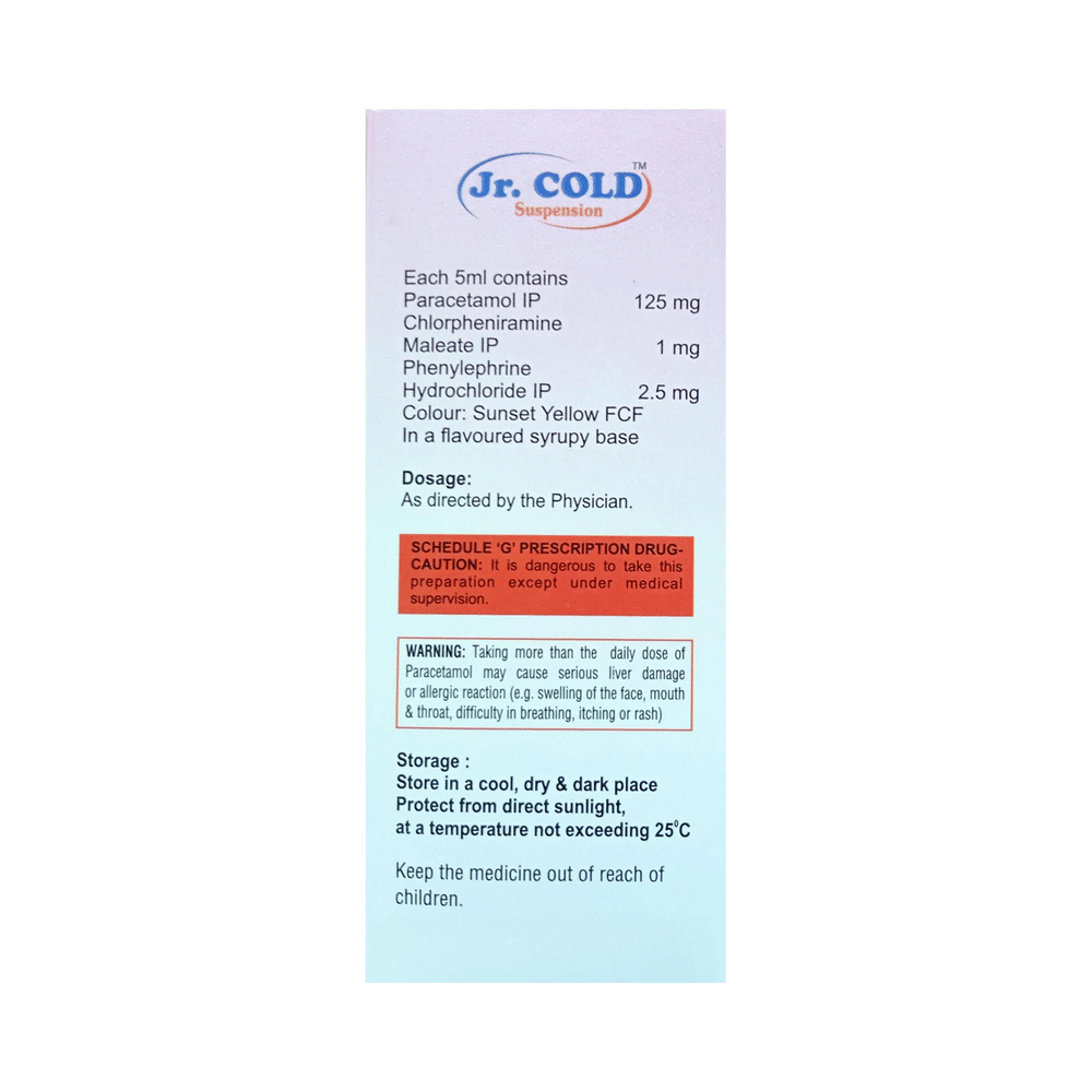 JR Cold Oral Suspension is a medicine used in the treatment of common cold symptoms. It provides relief from symptoms such as headache, sore throat, runny nose, muscular pain, and fever. JR Cold Oral Suspension can be taken with or without food. The dose and duration will depend on the severity of your condition. You should keep taking the medicine even if you feel better until the doctor says it is alright to stop using it.Using this medicine may cause a few common side effects such as nausea, vomiting, sleepiness, dizziness, and headache. If any of these side effects do not resolve with time or get worse, you should let your doctor know. Your doctor may be able to suggest ways of preventing or reducing the side effects. In general, you should try to use the smallest amount necessary to control your symptoms.Before using the medicine, you should tell your doctor if you have any other medical conditions or disorders. To make sure it is safe, you should let your doctor know all the other medicines you are taking. Also, tell your doctor if you have any problems with the liver or kidneys. Avoid consumption of alcohol while on treatment with this medicine as it may increase the chance of some side effects. Pregnant and breastfeeding women should consult their doctors first before using the medicine.
