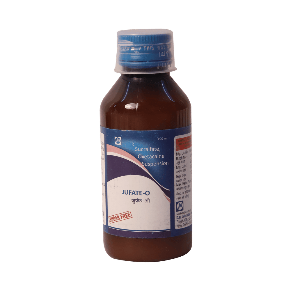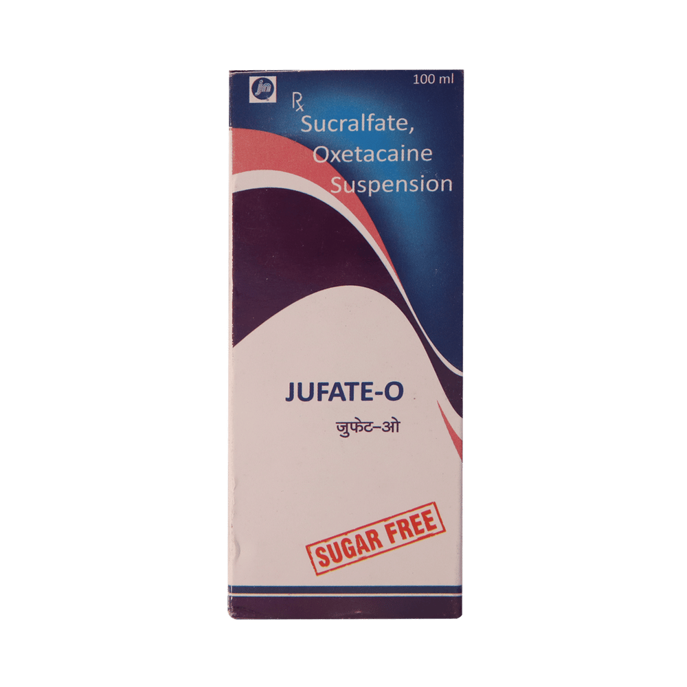 Jufate O 1000mg/10ml/20mg/10ml Suspension is a combination of two medicines: Sucralfate and Oxetacaine / Oxethazaine. Sucralfate is a medication to treat ulcers. It covers the damaged ulcer tissue in the stomach and protects it from acid or injury to facilitate healing. Oxetacaine / Oxethazaine is a local anesthetic whose numbing effect provides fast relief from pain caused due to ulcers or acidic injury in the stomach.