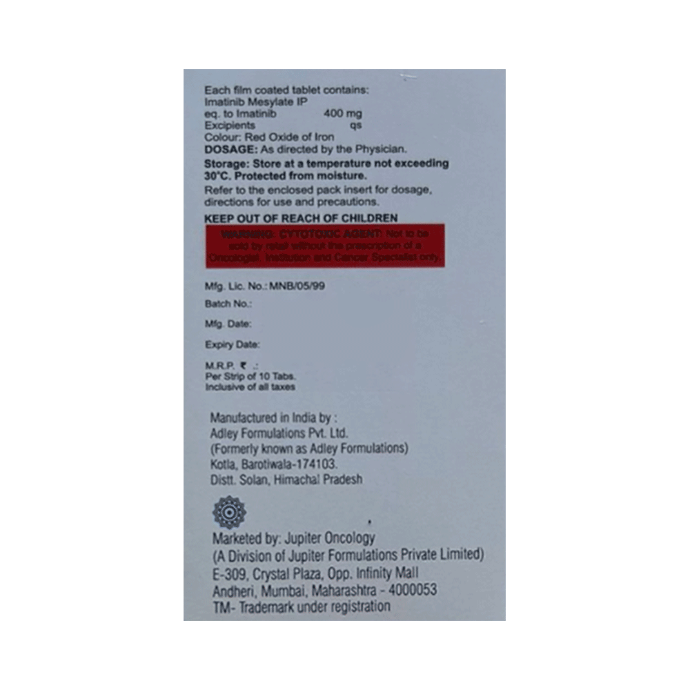 Jupitinib 400 Tablet is used to treat several types of cancers. It is most commonly prescribed to treat blood cancers (chronic myeloid leukemia and acute lymphocytic leukemia) and gastrointestinal stromal tumors. It works by targeting specific proteins that contribute to the growth and spread of cancer cells. Jupitinib 400 Tablet is also used for treatment of a skin tumor called dermatofibrosarcoma protuberans and a type of bone marrow condition called aggressive systemic mastocytosis. The medicine should be taken with food. Take it at the same time each day to get the most benefit. Continue taking it as long as your doctor advises for it. The duration of treatment varies according to your need and response to treatment. Taking it in the wrong way or taking too much can cause very serious side effects. It may take several weeks or months for you to see or feel the benefits but do not stop taking it unless your doctor tells you to.The most common side effects of this medicine include edema, nausea, vomiting, muscle cramps, musculoskeletal pain, diarrhea, rash, fatigue, and abdominal pain. Let your doctor know if you experience unexpected rapid weight gain. Your doctor may advise for regular monitoring of blood cells and liver function while you are taking this medicine. Do not drive or do anything requiring mental focus if you experience dizziness and blurry vision.Many other medicines can affect, or be affected by, this medicine so let your healthcare team know all medications you are using. This medicine is not recommended during pregnancy or while breastfeeding. The use of effective contraception by both males and females during treatment is important to avoid pregnancy.