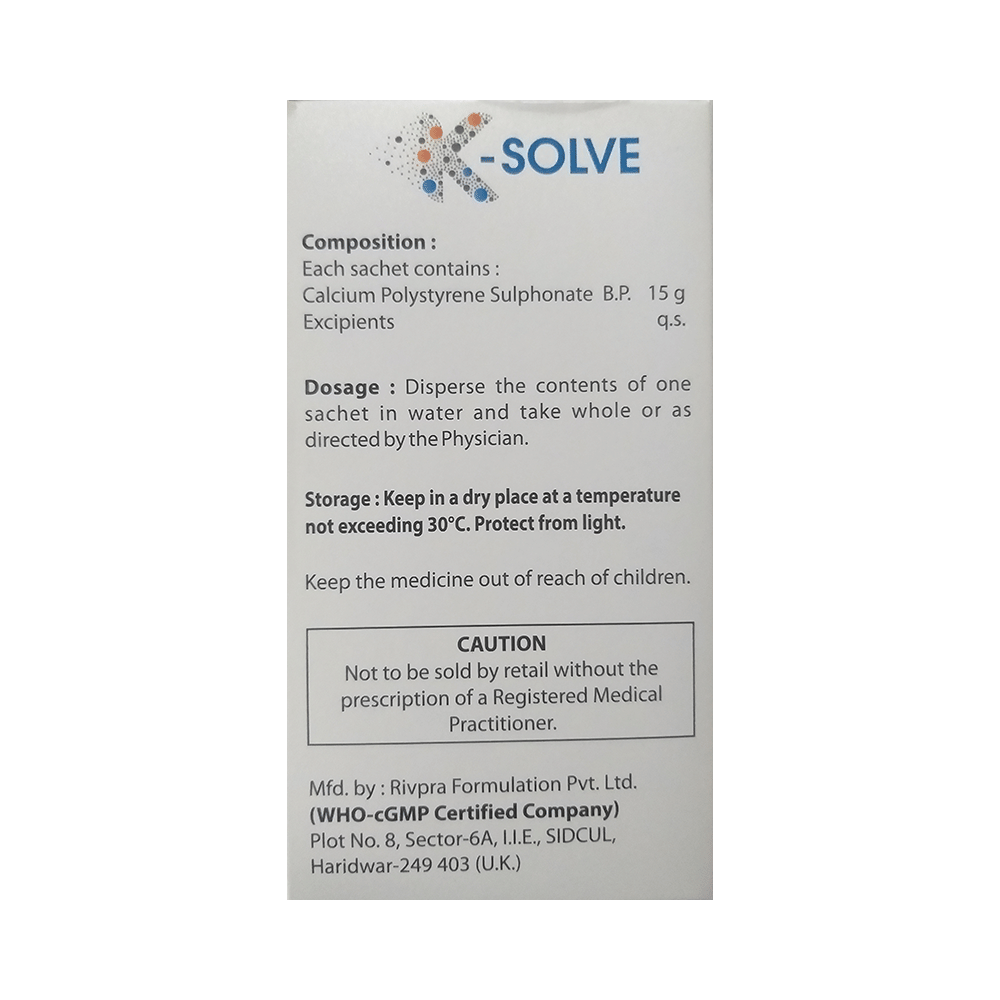 K-Solve Sachet is a medicine used for the reduction of high blood potassium levels in patients with chronic kidney disease who are undergoing dialysis. It helps removes the extra potassium from the body and brings potassium levels back to normal. K-Solve Sachet may be taken with or without food. Take it regularly at a fixed time each day to get the maximum benefit of the medicine. Avoid consumption of grapefruit juice while you are taking this medicine. Do not stop taking the medicine suddenly unless the doctor tells you so. Using of K-Solve Sachet may cause side effects such as vomiting, nausea, loss of appetite, diarrhea, and constipation. If the side effects persist or worsen, inform your doctor. You may also need to have regular blood tests to monitor the levels of potassium and other electrolytes, such as calcium, in your blood while taking this medicine.