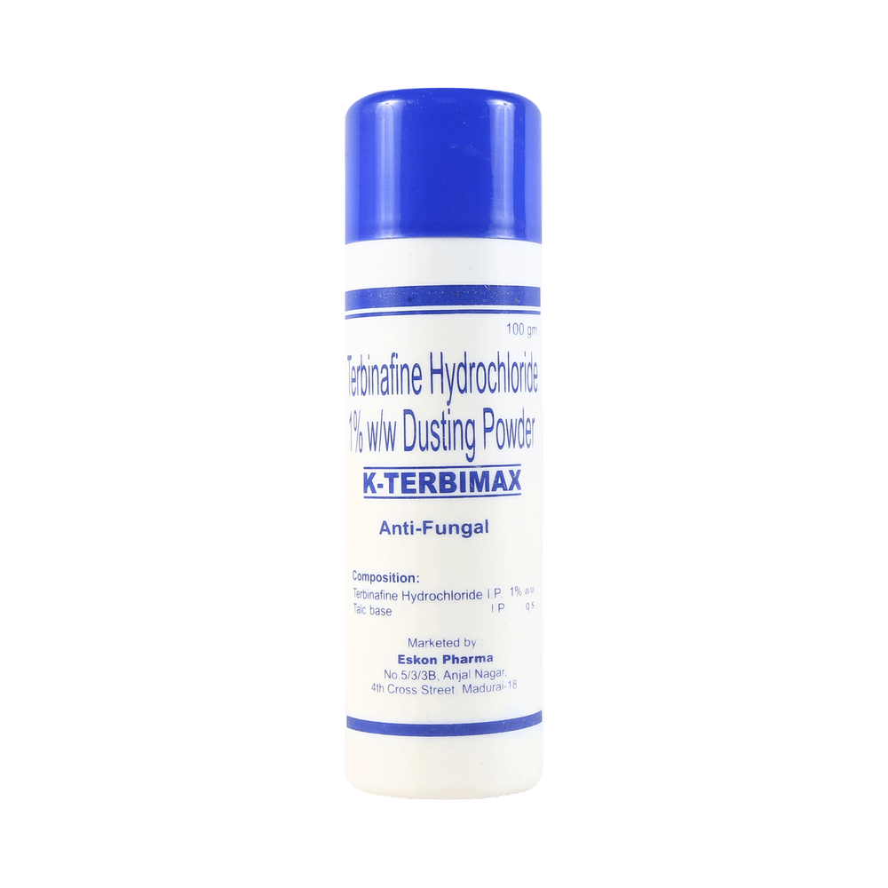 K Terbimax 1% Dusting Powder is used to treat a wide range of fungal infections of the skin and nails, including ringworm. It works by killing the fungi that cause the infection. This helps in clearing the infection and speeds up the healing process. K Terbimax 1% Dusting Powder is for external use only. It should be used in the dose and duration suggested by the doctor. The affected area should be clean and dry before the application of this medicine. You must wash your hands thoroughly before and after application. Do not stop using it until you have finished the complete course, even when you feel better. If you stop using this medicine too early, the fungi may continue to grow, and the infection may return or worsen.The most common side effects of this medicine include application site reactions like irritation, itching, redness (pruritus), and skin peeling (exfoliation). These are usually mild, but let your doctor know if they bother you or last more than a few days.Avoid direct contact with the eyes, nose, or mouth. If accidental exposure occurs, rinse immediately with plenty of water. You must inform your doctor if there is no improvement even after four weeks of treatment. It is not likely that other medicines you take by mouth or injection will affect the way this medicine works, but inform your doctor about all other medicines you are taking. Also, let your doctor know if you have used a similar medicine before and had an allergic reaction. Pregnant and breastfeeding mothers should consult their doctor before using it.