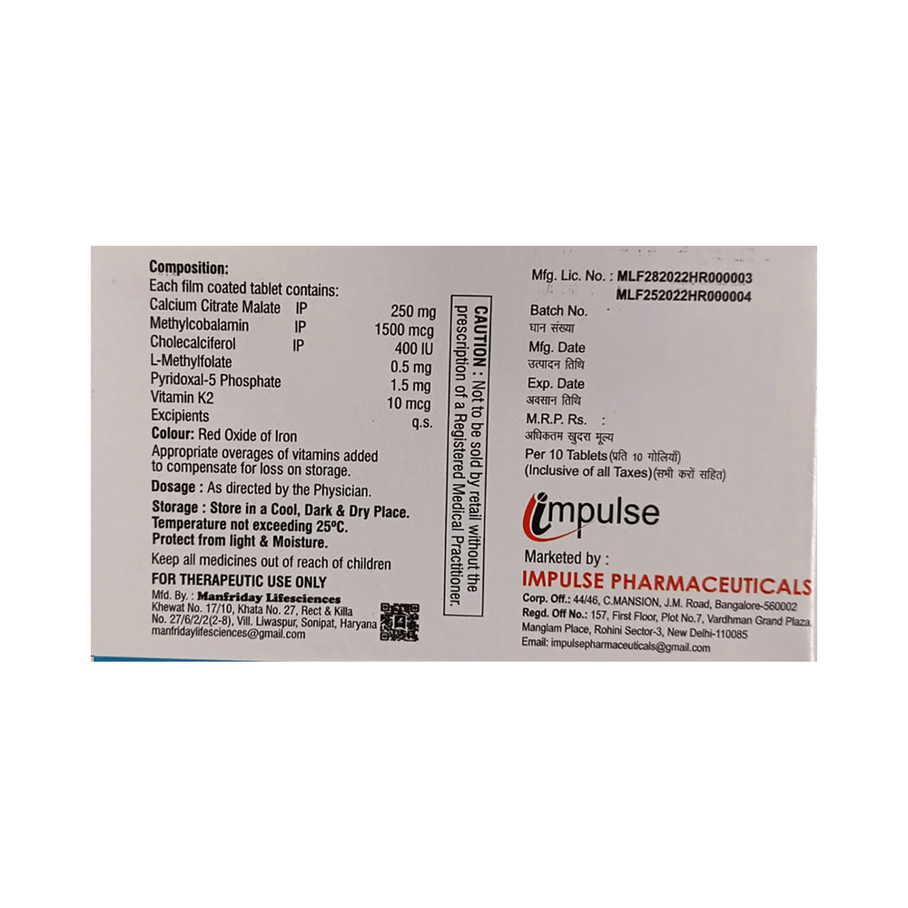 Salt Composition: L-Methyl Folate Calcium (0.5mg) + Pyridoxal-5-phosphate (1.5mg) + Methylcobalamin (1500mcg) + Vitamin D3 (400IU) + Calcium Citrate Malate (250mg) + Vitamin K2-7 (10mcg)