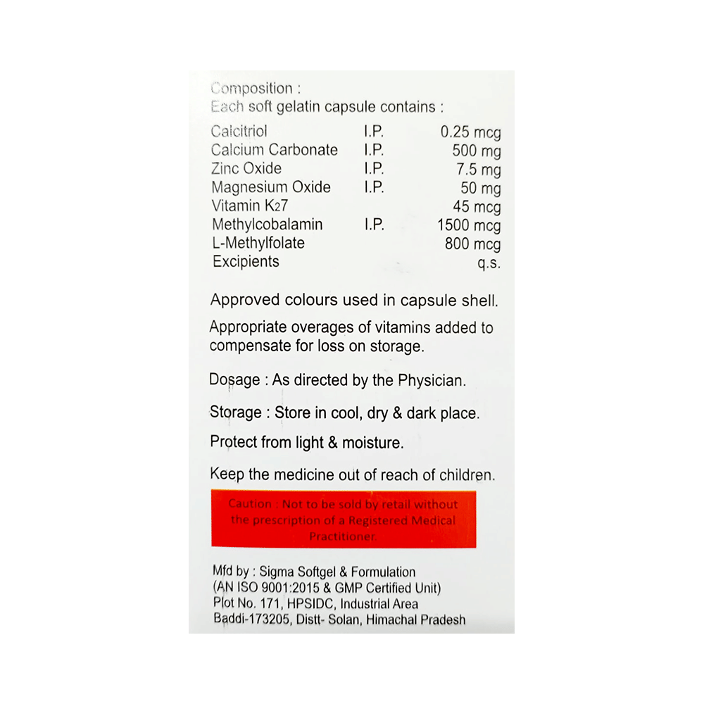Salt Composition: Calcitriol (0.25mcg) + Calcium Carbonate (500mg) + Zinc (7.5mg) + Magnesium (50mg) + Vitamin K2-7 (45mcg) + Methylcobalamin (1500mcg) + L-Methyl Folate (800mcg)