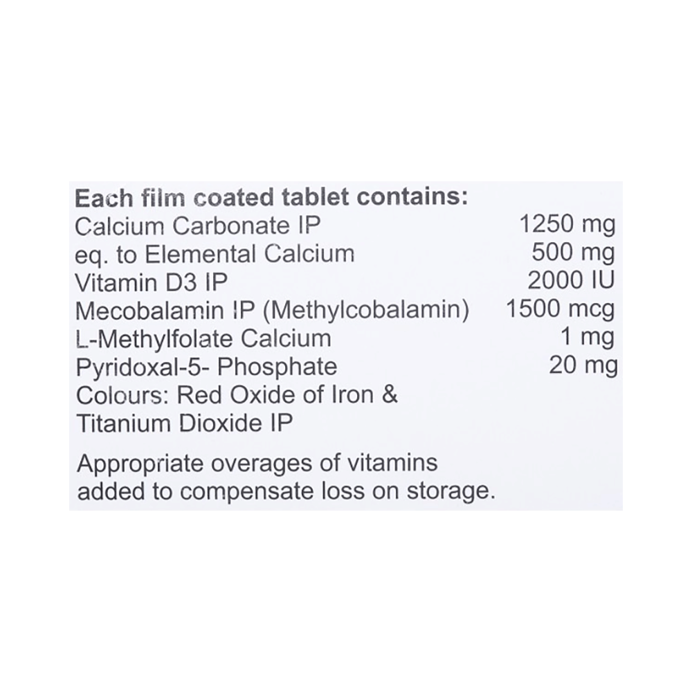 Salt Composition: Calcium Carbonate (1250mg) + Vitamin D3 (2000IU) + Methylcobalamin (1500mcg) + L-Methyl Folate Calcium (1mg) + Pyridoxal-5-phosphate (20mg)