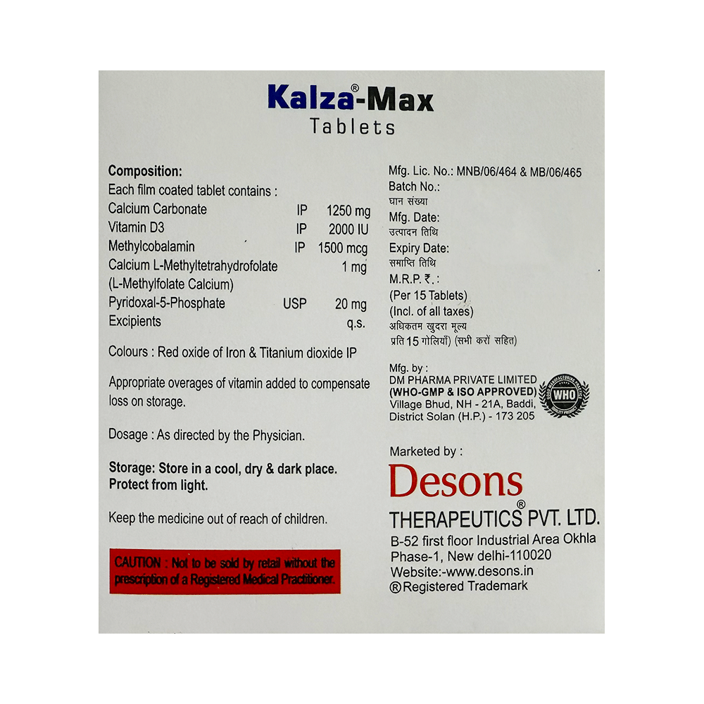 Kalza-Max Tablet is a combination of five medicines : Calcium Carbonate, Vitamin D3, Methylcobalamin, L-Methyl Folate Calcium, and Pyridoxal-5-phosphate. Calcium carbonate is a dietary supplement used when the amount of calcium taken in the diet is not enough. Vitamin D3 is a form of vitamin D. It raises vitamin D levels in your blood. This in turn raises calcium levels in your blood by helping you absorb more calcium from food. Methylcobalamin is a form of vitamin B12 that restores its level in the body thereby helping in treating certain anemias and nerve problems. L-Methyl Folate Calcium and Pyridoxal-5-phosphate are nutritional supplements that provide essential nutrients to our body and improve overall health.