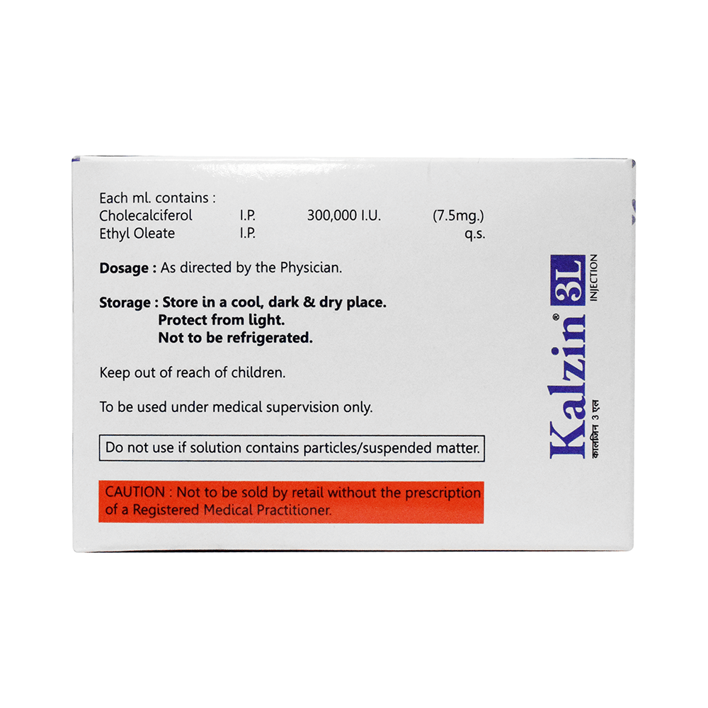 Kalzin 3L Injection helps your body absorb calcium, which is important for maintaining strong bones. It is prescribed when your diet alone does not provide enough vitamin D. It may be used to treat certain bone conditions, such as thinning of the bones (osteoporosis). Kalzin 3L Injection is generally given under the supervision of a doctor or a nurse and should not be self-administered. The doctor will decide the dose and duration of the treatment. If you are using it to treat osteoporosis, you may also be prescribed other medicines. This medicine may be only a part of a complete treatment program that includes changing your diet and taking calcium and vitamin supplements. Ask a doctor or dietitian about the foods you should eat to get enough calcium and vitamin D.There is limited data on the side effects of Kalzin 3L Injection. However, some may experience mild injection site reactions like redness and swelling. Let your doctor know if you experience any symptoms while taking the medicine. They can suggest ways to treat or manage the side effects.Before receiving this medicine, tell your doctor if you have high calcium levels in your blood or if you have any preexisting medical conditions. Let your doctor know about all the other medicines you are taking to make sure it is safe for you. Pregnant and breastfeeding women should ask a doctor before taking Kalzin 3L Injection to make sure it is safe for them.