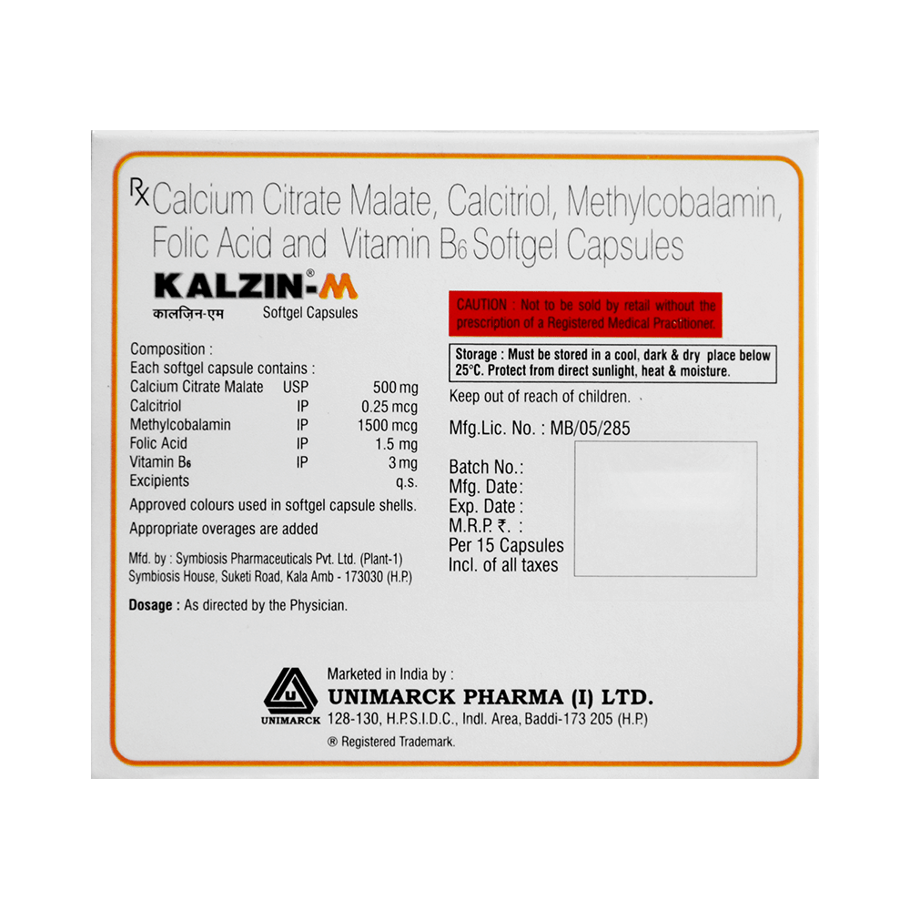 Kalzin-M Softgel Capsule is a medicine used to treat nutritional deficiencies. It helps in the proper growth and development of cells and bone and improves heart health. It also helps in protein synthesis and the production of blood cells, like red blood cells or white blood cells, and boosts immunity. Kalzin-M Softgel Capsule may be taken with or without food. It should be used in the dose and duration as prescribed by your doctor. It is advised to take this medicine at a fixed time. This medicine should not be taken more than the recommended dose.There is limited data on the side effects of Kalzin-M Softgel Capsule. Let your doctor know if you experience any symptoms while taking Kalzin-M Softgel Capsule. They may be able to suggest ways to treat or manage the side effects.Before taking this medicine, tell your doctor if you have any other health conditions. Inform your doctor if you are taking any other medicines or if you are pregnant or breastfeeding.