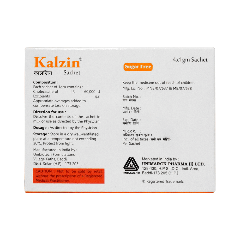 Kalzin Sachet Sugar Free is used in the treatment of vitamin D deficiency and osteoporosis. It helps the body to absorb calcium. Calcium is essential for maintaining strong and healthy bones. It is used when your diet does not provide enough calcium. Kalzin Sachet Sugar Free should be taken as directed by your doctor. It is best taken with or after food, as this helps your body absorb it, and you should take it regularly to get the most benefits. If you are using it to treat osteoporosis, you will also be prescribed other medicines. This medicine may be only part of a complete treatment program that includes making changes to your diet and taking calcium and vitamin supplements. Learn about the foods you should eat to ensure you get enough calcium and vitamin D.Kalzin Sachet Sugar Free has few side effects, and none are common. If you take too much, you may feel weakness, muscle pain, or a metallic taste in your mouth. If you experience any such side effects, speak with your doctor. They may be able to help you reduce or treat the symptoms.Before taking this medicine, tell your doctor if you have high calcium levels in your blood or if you have any heart, kidney, or liver disease. Some other medicines can decrease the absorption of vitamin D3, so let your doctor know about all the other medicines you are taking to make sure you are safe. This medicine may help during pregnancy when your body needs more vitamin D, but too much could harm your baby. Discuss it with your doctor.