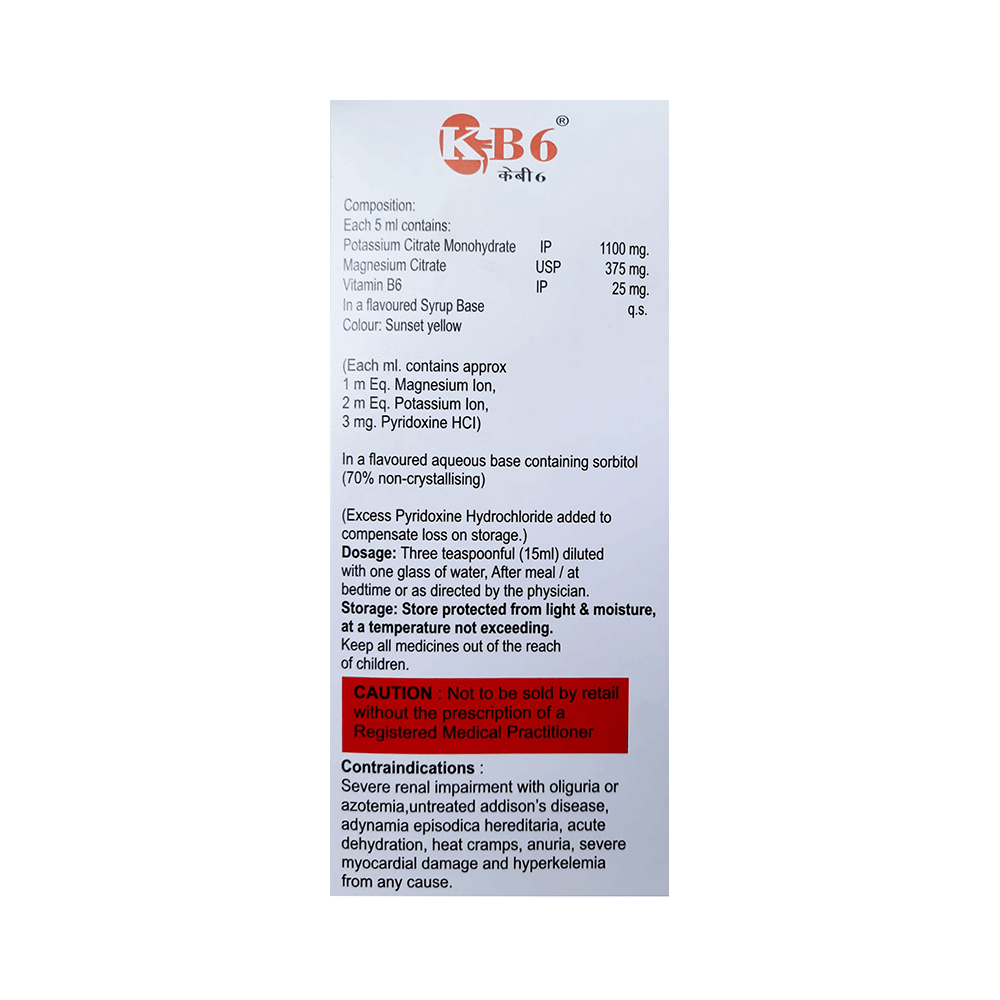 KB6 Oral Solution Orange Sugar Free is a combination of three medicines: Potassium Citrate, Magnesium Citrate and Vitamin B6 (Pyridoxine) which prevent kidney stones. Potassium Citrate and Magnesium Citrate raise urine pH and prevents the formation, growth and aggregation of crystals in the kidneys, thereby preventing stones. Vitamin B6 (Pyridoxine) is added as its deficiency is associated with increased synthesis of oxalate, which is one of the constituents of kidney stones.