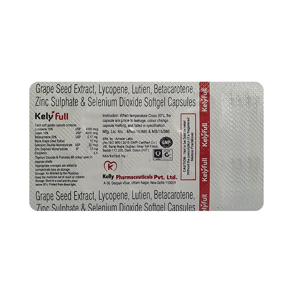Kelyfull Softgel Capsule is a combination of vitamins, antioxidants, and minerals. Beta-carotene and lycopene are powerful antioxidants that protect the body from damaging molecules called free radicals and help boost the immune system. The antioxidants in black grape seed extract may help alleviate the oxidative stress, inflammation, and tissue damage that can occur alongside chronic diseases. Lutein functions as a light filter and protects the eye tissues from sunlight damage. Selenium dioxide acts as a resource of selenium that prevents cell damage and protects the body from the poisonous effects of heavy metals and other harmful substances. Zinc is needed for the body's immune system to work properly. It plays a role in growth, wound healing, and maintaining gut health. Zinc is also needed for the senses of taste and smell.