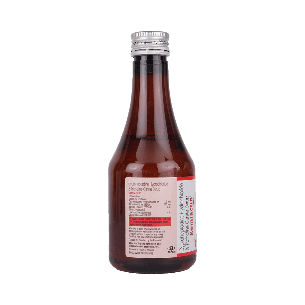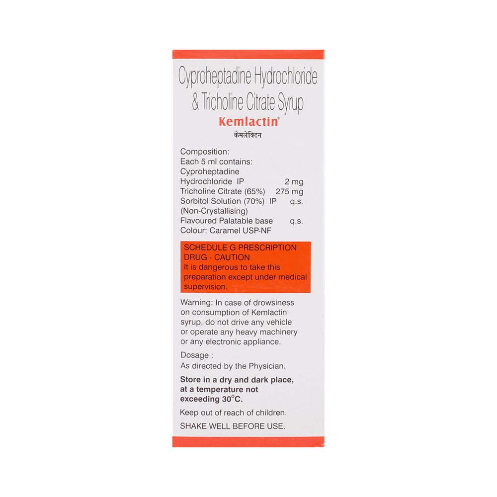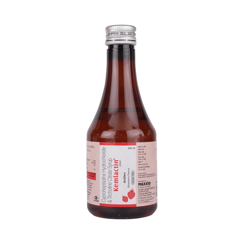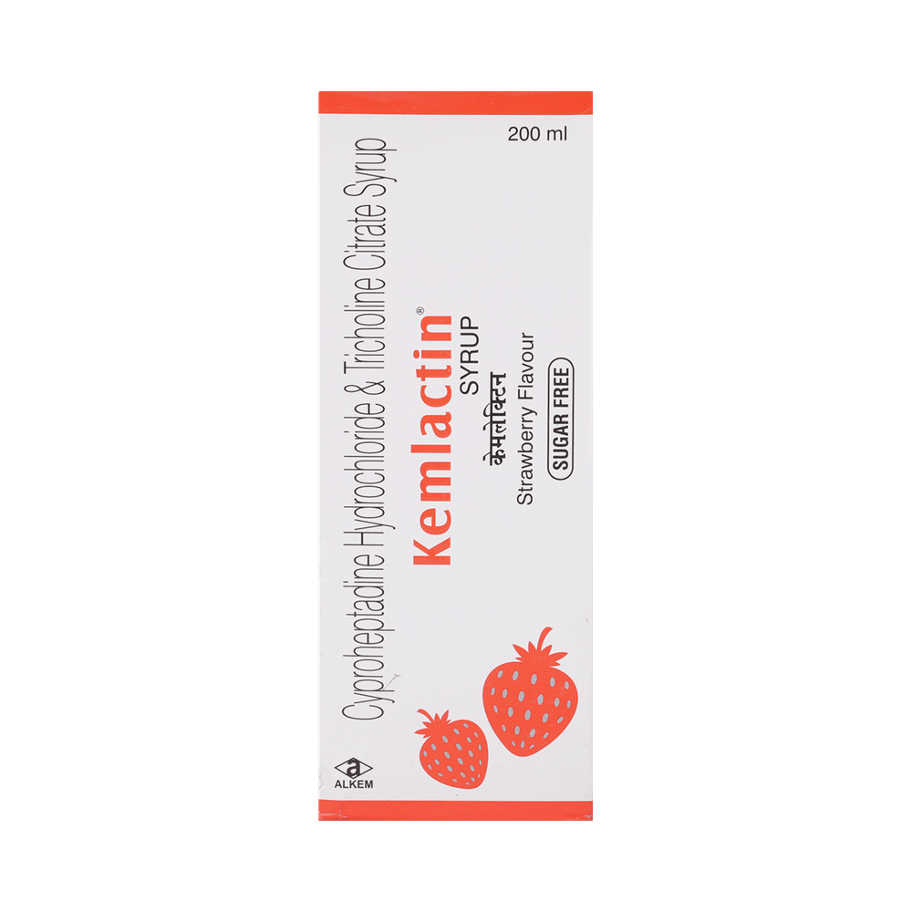 Kemlactin Syrup Strawberry Sugar Free is a combination medicine used to treat loss of appetite. It is an effective appetite stimulant. It works by reducing the effect of a chemical messenger which regulates appetite. Kemlactin Syrup Strawberry Sugar Free is taken with or without food in a dose and duration as advised by the doctor. The dose you are given will depend on your condition and how you respond to the medicine. You should keep taking this medicine for as long as your doctor recommends. Let your healthcare team know about all other medications you are taking as some may affect, or be affected by this medicine.The most common side effects are constipation, dryness in mouth, and blurred vision. Most of these are temporary and usually resolve with time. Contact your doctor straight away if you are at all concerned about any of these side effects. It can cause dizziness, so do not drive or do anything that requires mental focus until you know how this medicine affects you. Avoid drinking alcohol while taking this medicine as it can worsen your sleepiness.Never support self-medication or recommend your medicine to another person. Before taking it, you should tell your doctor if you have any kidney or liver diseases so that your doctor can prescribe a suitable dose for you. Pregnant or breastfeeding women should also consult their doctor.