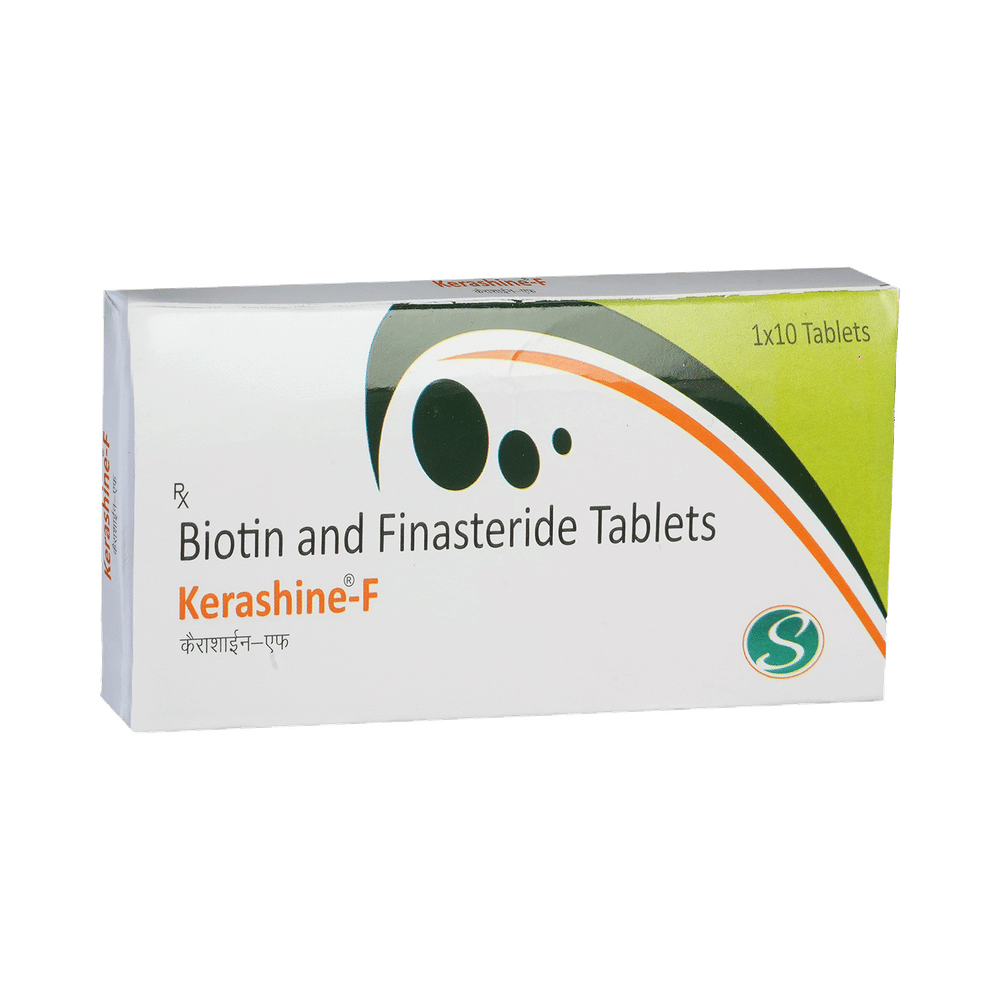 Kerashine-F Tablet is a combination of two medicines: Biotin and Finasteride which treat hair loss. Biotin is a form of vitamin B. It is involved in the synthesis of keratin, a natural protein that aids in hair growth. Finasteride is a 5-alpha reductase inhibitor. It blocks the body's production of a male hormone in the scalp that stops hair growth, thereby reversing the balding process and preventing further hair loss.
