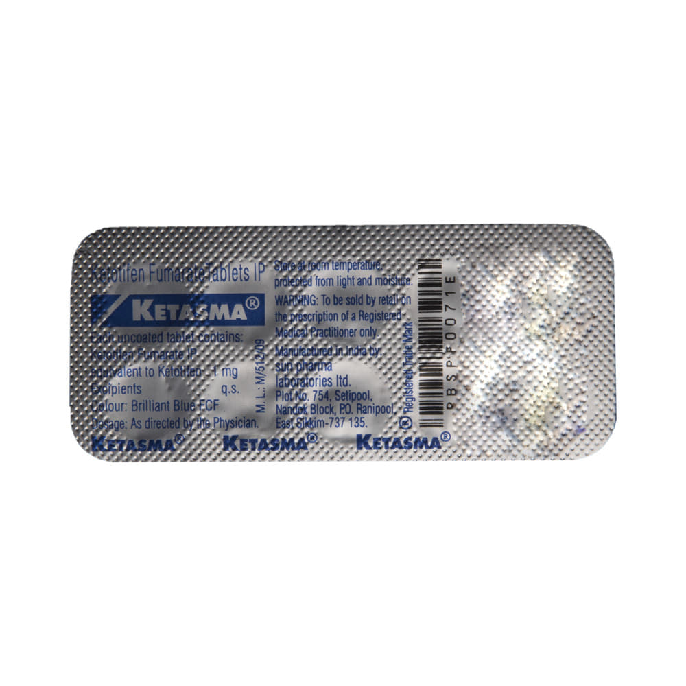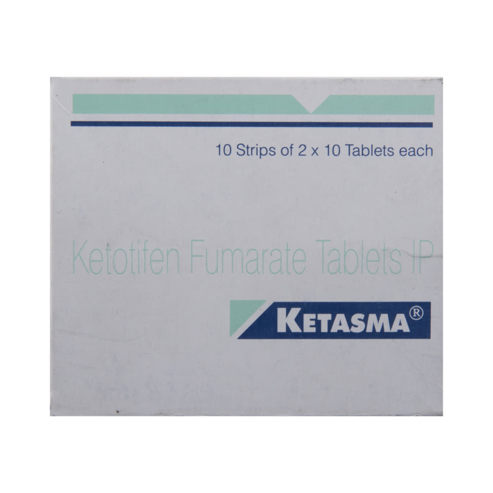 Ketasma Tablet is a prescription medicine used to prevent asthma symptoms and allergic eye conditions. It helps reduce asthma attacks by lowering lung inflammation and relieves eye allergies by reducing itching, redness, and irritation. Ketasma Tablet can be taken with or without food. Take it in the exact dose and duration as advised by your doctor. The dose and how often you take it depend on what you are taking it for. Your doctor will decide how much you need to improve your symptoms. Take it for as long as it is prescribed to you.The most common side effects of this medicine include weight gain, respiratory infections, and rash. Let your doctor know if you experience these symptoms; however, they are usually temporary. Do not drive, use machinery, or do any activity that requires attention, as medicine may cause dizziness. Consult your doctor if your condition does not improve or if the side effects bother you.Before taking this medicine, tell your doctor if you have epilepsy or diabetes. Your doctor should also know about all other medicines you are taking, as many of these may make this medicine less effective or change the way it works. This medicine is usually not safe to take during pregnancy and breastfeeding; ask the doctor if required.
