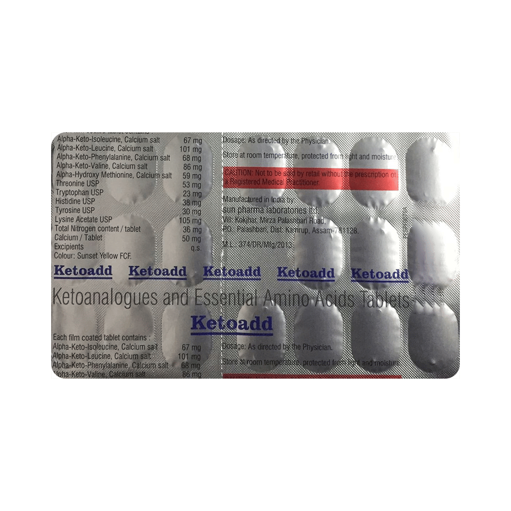 Ketoadd Tablet is a nutritional supplement used in the treatment of chronic kidney disease. It reduces urea levels in the blood and helps prevent the progression of kidney disease. This way it delays the risk of undergoing long-term dialysis. Ketoadd Tablet is to be taken by mouth with or without food. Take it in the exact dose and duration as advised by the doctor. Taking it along with a low-protein diet may help get the best of the medicine. Ensure that you maintain adequate calorie intake during treatment. While you are taking this medicine, your doctor may advise regular monitoring of serum calcium levels.There is limited data on the side effects of Ketoadd Tablet. Let your doctor know if you experience any symptoms while taking Ketoadd Tablet. They may be able to suggest ways to treat or manage the side effects.Before taking Ketoadd Tablet, it is important to tell your doctor if you are taking any other medicines for other health conditions. Avoid taking Ketoadd Tablet if you are allergic to its ingredients, or have high calcium levels (hypercalcemia). Regular monitoring of calcium levels is recommended during use.Avoid combining Ketoadd Tablet with calcium-containing supplements or certain antibiotics (e.g., tetracyclines, quinolones) without consulting a doctor, as they may interfere with absorption. Pregnant, breastfeeding women, and individuals with liver disease should seek a doctor’s advice before use. Avoid activities requiring full mental alertness, such as driving, until you know how the medication affects you.