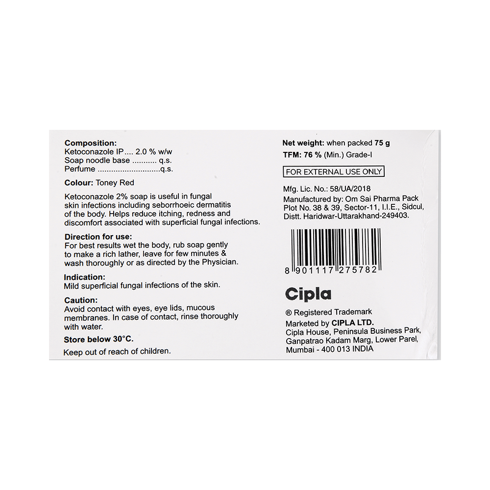 In Treatment of Fungal skin infectionsKetoCIP Soap is an antifungal medicine that treats skin infections caused by fungi. It works by killing the fungi and stopping their growth, helping to clear the infection and relieve symptoms like itching, redness, and scaling. For best results, use this medicine for the full prescribed duration, even if your symptoms improve, to prevent the infection from returning. Depending on the infection, treatment may take several weeks. In some cases, occasional application may be needed even after the infection clears to prevent recurrence.