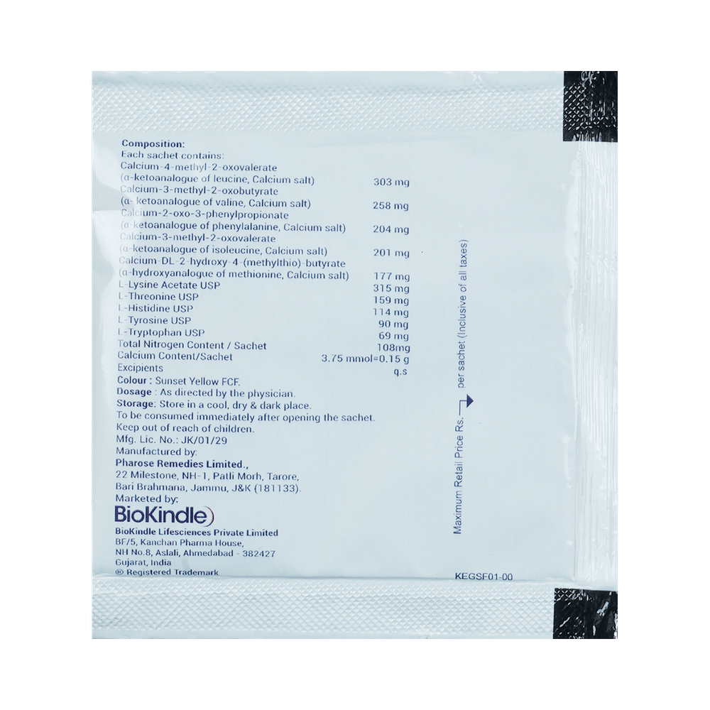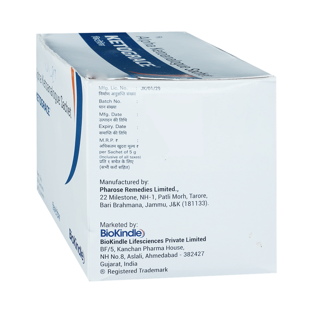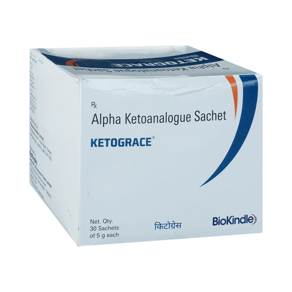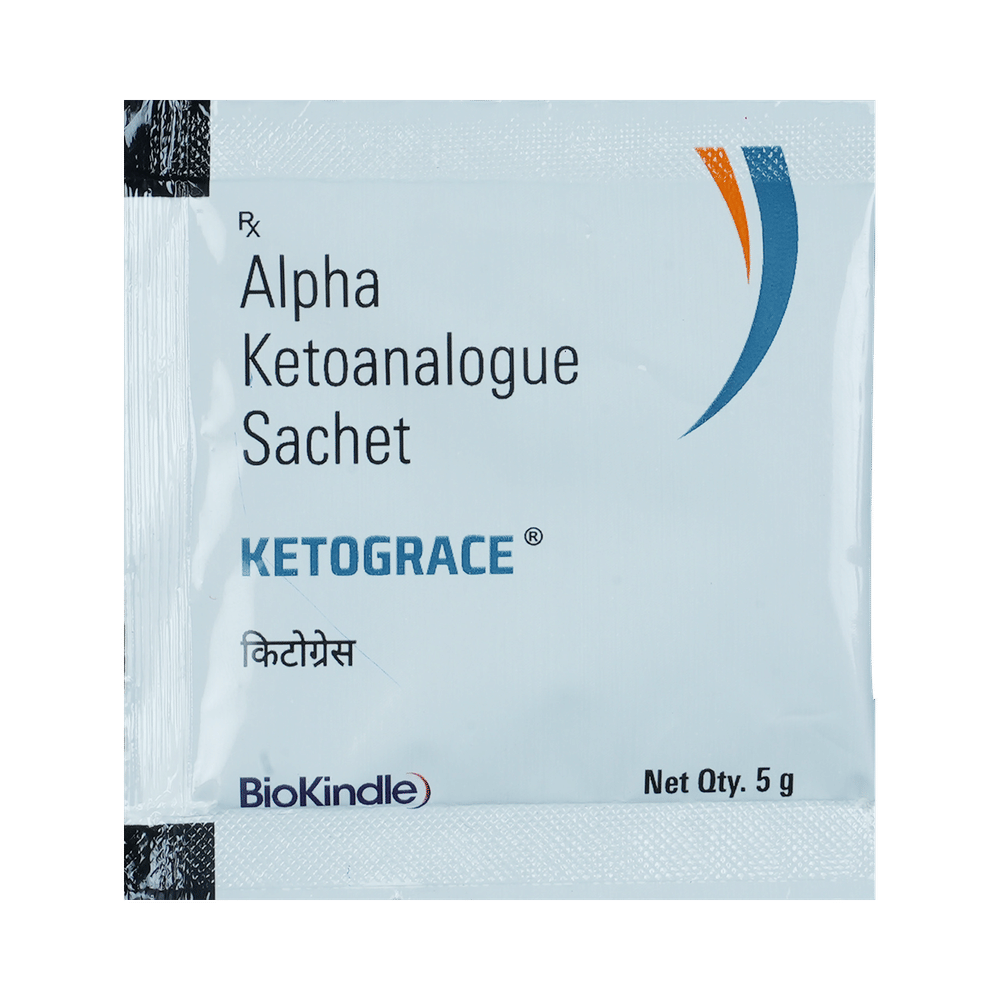 Ketograce Sachet is a nutritional supplement used in the treatment of chronic kidney disease. It reduces urea levels in the blood and helps prevent the progression of kidney disease. This way it delays the risk of undergoing long-term dialysis. Ketograce Sachet is to be taken by mouth with or without food. Take it in the exact dose and duration as advised by the doctor. Taking it along with a low-protein diet may help get the best of the medicine. Ensure that you maintain adequate calorie intake during treatment. While you are taking this medicine, your doctor may advise regular monitoring of serum calcium levels.There is limited data on the side effects of Ketograce Sachet. Let your doctor know if you experience any symptoms while taking Ketograce Sachet. They may be able to suggest ways to treat or manage the side effects.Before taking Ketograce Sachet, it is important to tell your doctor if you are taking any other medicines for other health conditions. Avoid taking Ketograce Sachet if you are allergic to its ingredients, or have high calcium levels (hypercalcemia). Regular monitoring of calcium levels is recommended during use.Avoid combining Ketograce Sachet with calcium-containing supplements or certain antibiotics (e.g., tetracyclines, quinolones) without consulting a doctor, as they may interfere with absorption. Pregnant, breastfeeding women, and individuals with liver disease should seek a doctor’s advice before use. Avoid activities requiring full mental alertness, such as driving, until you know how the medication affects you.
