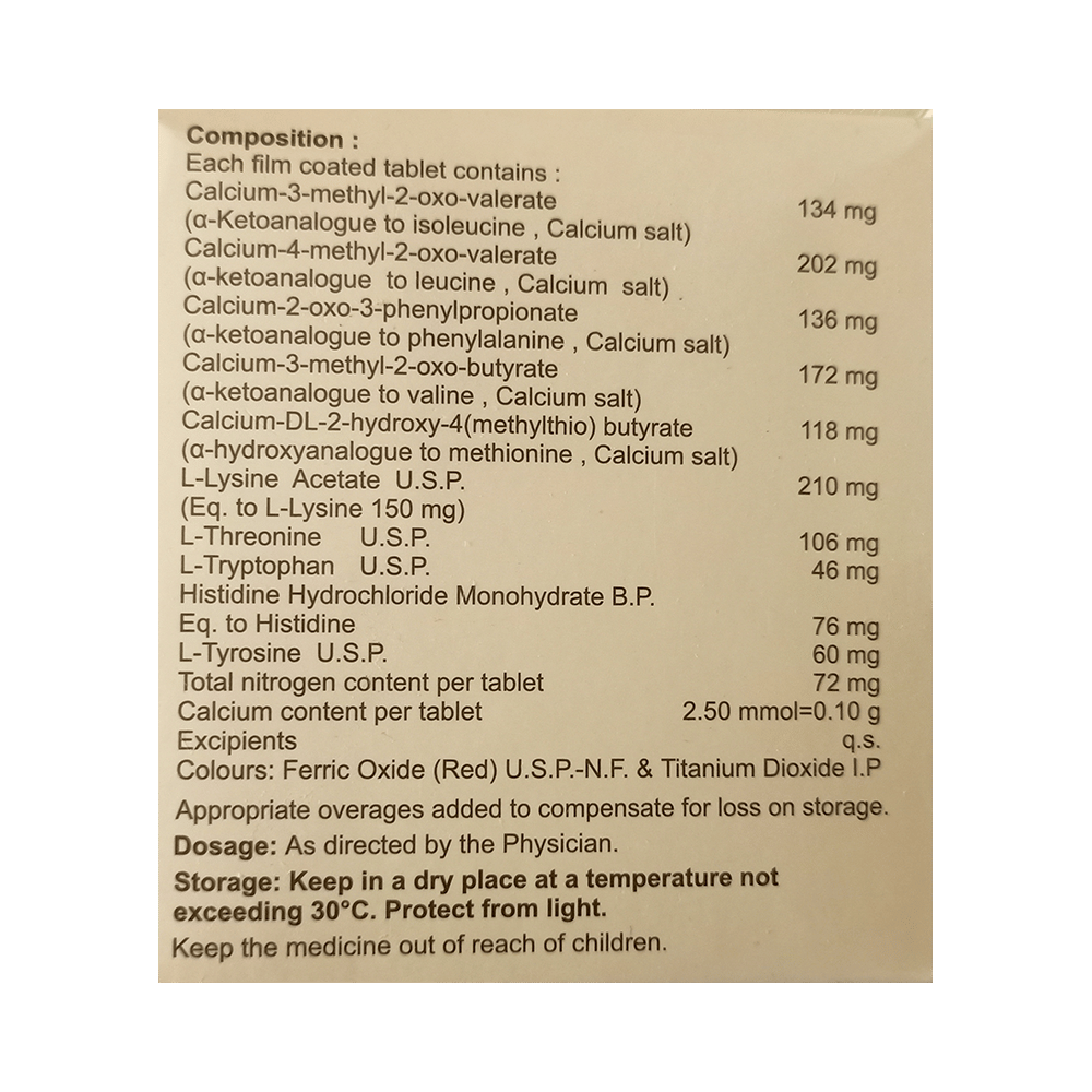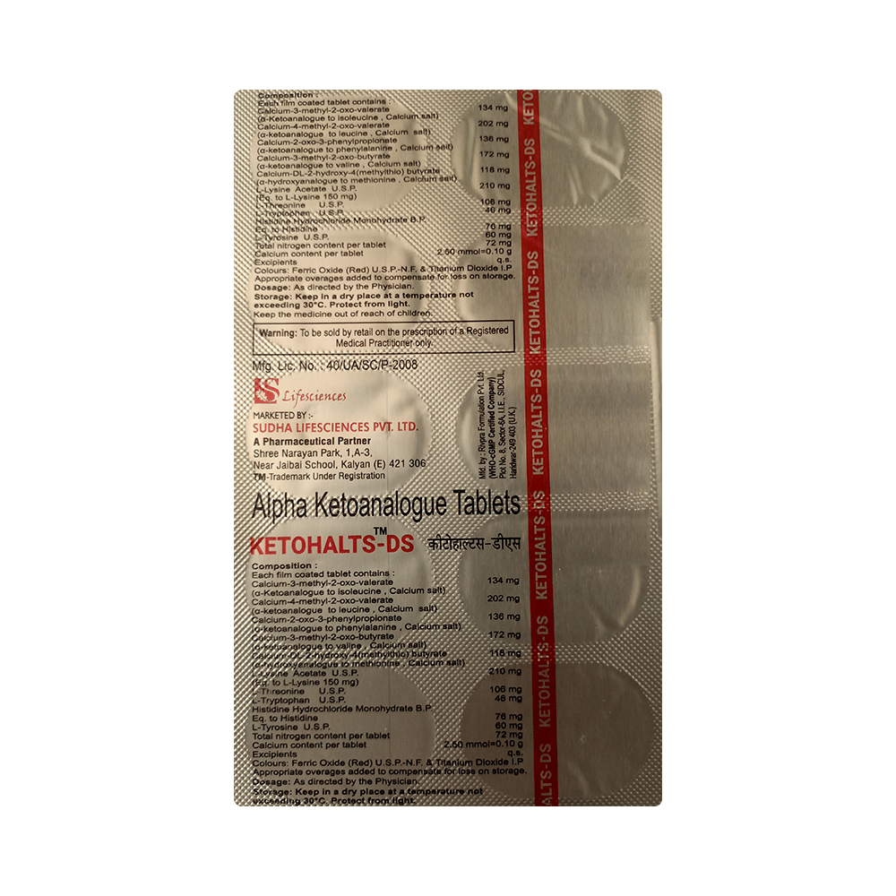 Ketohalts-DS Tablet belongs to a class of drugs called nutritional supplements. It follows the same catabolic pathways as amino acids and works by improving the metabolism of protein in the body, thereby improving renal function.