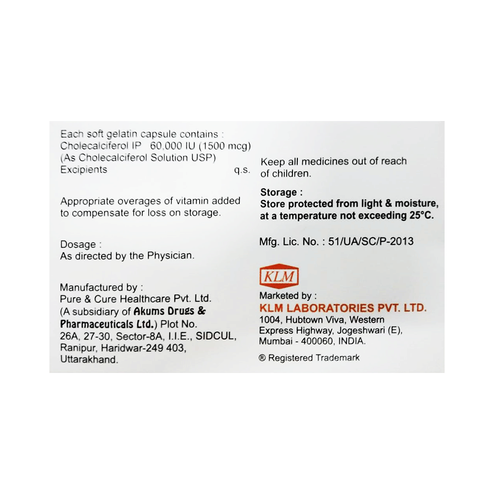 KLM-D3 60K Capsule is used in the treatment of vitamin D deficiency and osteoporosis. It helps the body to absorb calcium. Calcium is essential for maintaining strong and healthy bones. It is used when your diet does not provide enough calcium. KLM-D3 60K Capsule should be taken as directed by your doctor. It is best taken with or after food, as this helps your body absorb it, and you should take it regularly to get the most benefits. If you are using it to treat osteoporosis, you will also be prescribed other medicines. This medicine may be only part of a complete treatment program that includes making changes to your diet and taking calcium and vitamin supplements. Learn about the foods you should eat to ensure you get enough calcium and vitamin D.KLM-D3 60K Capsule has few side effects, and none are common. If you take too much, you may feel weakness, muscle pain, or a metallic taste in your mouth. If you experience any such side effects, speak with your doctor. They may be able to help you reduce or treat the symptoms.Before taking this medicine, tell your doctor if you have high calcium levels in your blood or if you have any heart, kidney, or liver disease. Some other medicines can decrease the absorption of vitamin D3, so let your doctor know about all the other medicines you are taking to make sure you are safe. This medicine may help during pregnancy when your body needs more vitamin D, but too much could harm your baby. Discuss it with your doctor.