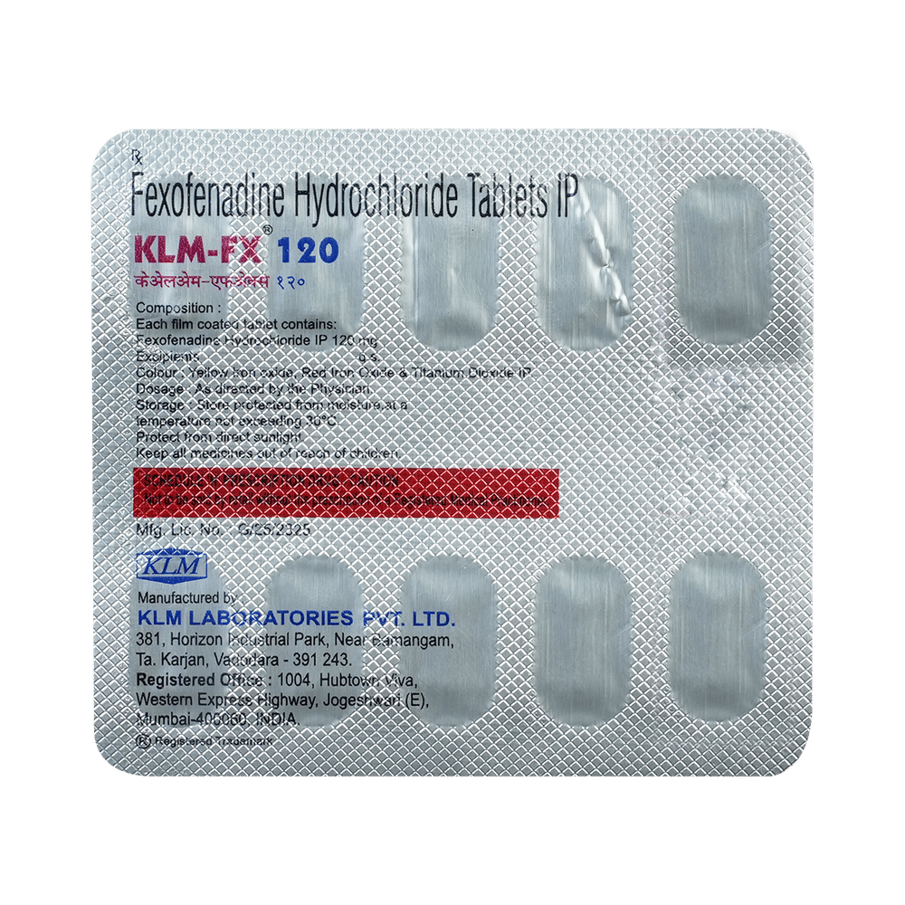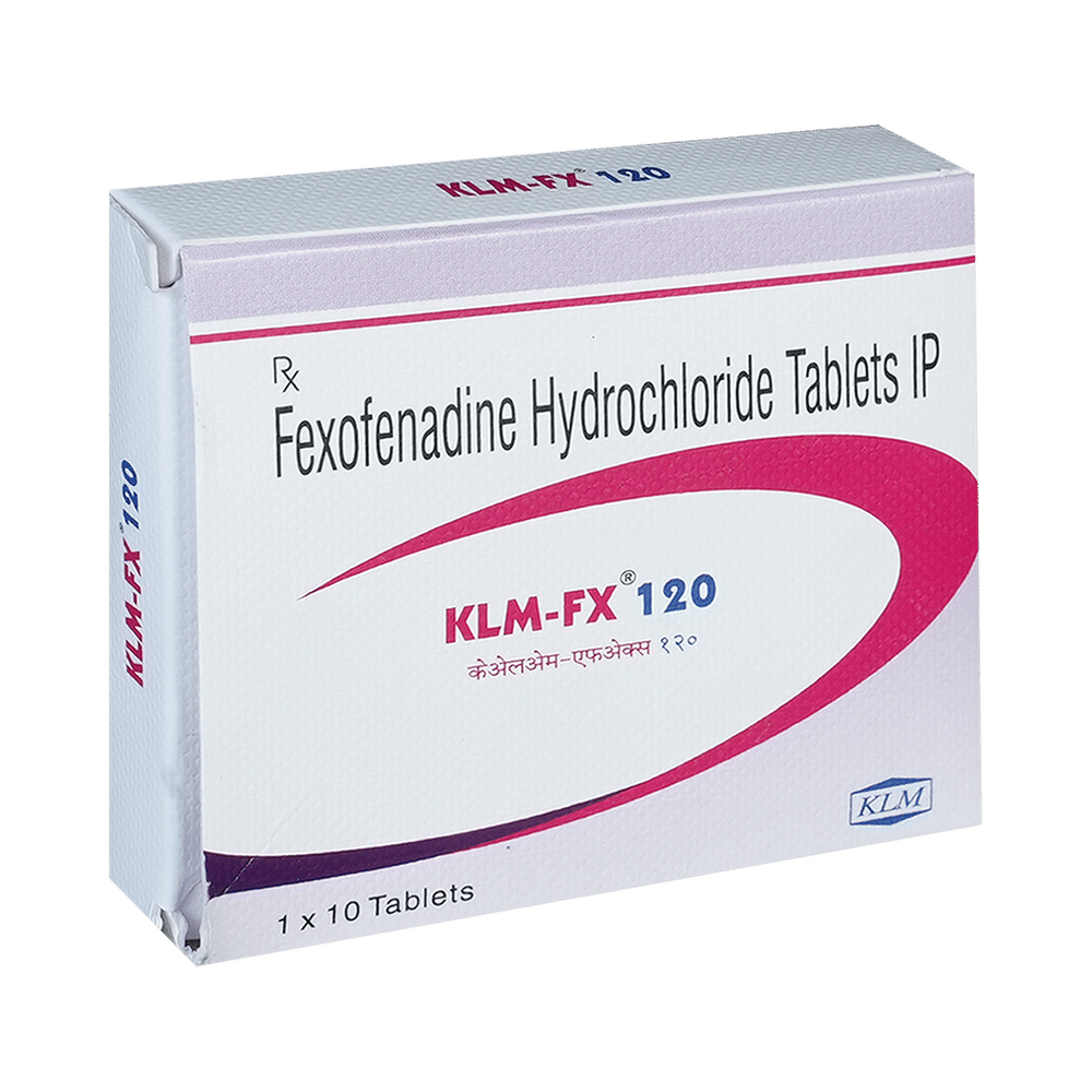 KLM-FX 120 Tablet is an anti-allergy medicine used in the treatment of allergic symptoms such as runny nose, congestion or stuffiness, sneezing, itching, swelling, and watery eyes. It also helps treat skin allergies with itching, redness, or swelling. KLM-FX 120 Tablet may be taken with or without food, in the dose and duration as advised by the doctor. The dose you are given will depend on your condition and how you respond to the medicine. You should keep taking this medicine for as long as your doctor recommends. Do not stop taking it without consulting your doctor.The most common side effects are headache, drowsiness, dizziness, and nausea. Most of these are temporary and usually resolve with time. Please consult your doctor if any of these side effects do not resolve or persist for a longer duration.Do not self-medicate or recommend your medicine to another person even if you see the similarity in symptoms. Consult your doctor to get the most benefit. Inform your doctor if you are suffering from any problems related to the kidneys, liver, or heart. Pregnant and breastfeeding mothers should not take this medicine without consulting a doctor.