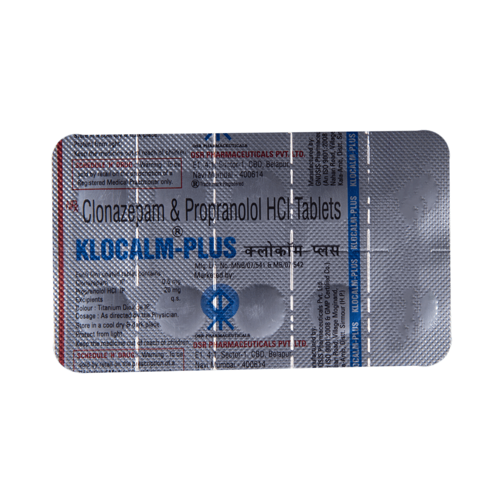 Klocalm-Plus Tablet is a prescription medicine used to treat anxiety disorder. It calms the brain by decreasing the abnormal and excessive activity of the nerve cells. It blocks the action of certain chemical messengers on the heart and blood vessels. This reduces heart rate and blood pressure. Klocalm-Plus Tablet should be taken on an empty stomach. However, it is advised to take it at the same time each day as this helps to maintain a consistent level of medicine in the body. Take this medicine in the dose and duration advised by your doctor as it has high habit-forming potential. If you miss a dose of this medicine, take it as soon as you remember. Finish the full course of treatment even if you feel better. It is important not to stop taking this medicine suddenly as it may cause withdrawal symptoms. Avoid consuming alcohol while taking this medicine as this may reduce its effectiveness.Some common side effects of this medicine include confusion, memory impairment, slow heart rate, tiredness, and nightmare. It may also cause dizziness and sleepiness. So, do not drive or do anything that requires mental focus until you know how this medicine affects you. It is important to inform your doctor if you develop any unusual changes in mood or depression as this medicine may cause suicidal thoughts.Take caution while taking medicine if you are suffering from liver disease. Your doctor should also know about all other medicines you are taking as many of these may make this medicine less effective or change the way it works. Inform your doctor if you are pregnant, planning pregnancy, or breastfeeding.