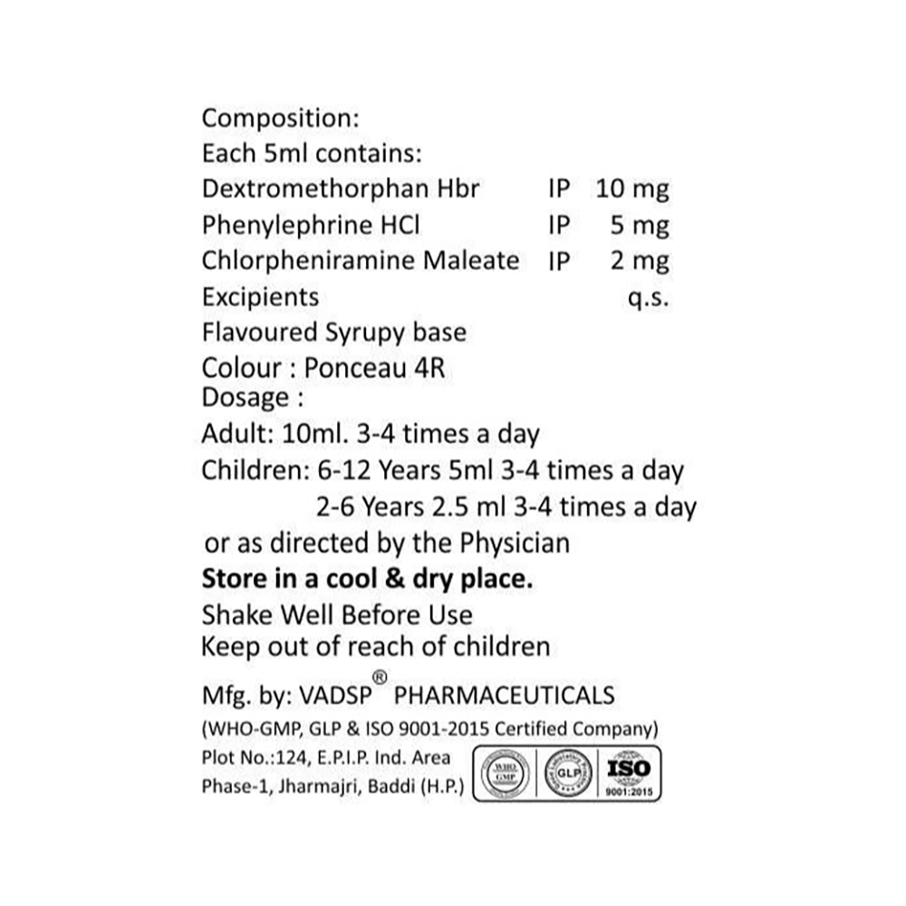 Salt Composition: Phenylephrine (5mg/5ml) + Chlorpheniramine Maleate (2mg/5ml) + Dextromethorphan Hydrobromide (10mg/5ml)