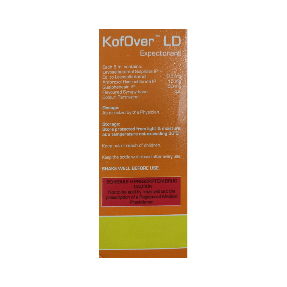 Kofover LD Expectorant Pineapple + Mixed Fruit is a combination of three medicines: Levosalbutamol, Ambroxol and Guaifenesin which relieve cough with mucus. Levosalbutamol is a bronchodilator. It works by relaxing the muscles in the airways and widens airways. Ambroxol is a mucolytic which thins and loosens mucus (phlegm), making it easier to cough out. Guaifenesin is an expectorant which decreases the stickiness of mucus (phlegm) and helps in its removal from the airways.