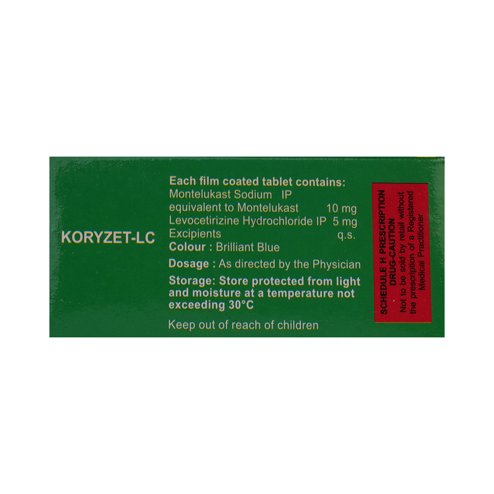 In Treatment of Allergic skin conditionsKoryzet-LC Tablet is effective in treating allergic skin conditions with inflammation and itching. It reduces the actions of chemicals in the body that cause inflammation of the skin. When used correctly it is a safe and effective treatment. It reduces the redness, rash, pain or itchiness caused by your skin’s reaction to an irritant. It thus improves your self-esteem and confidence as your appearance changes. Keep taking it for as long as it is prescribed to get the full benefits.In Treatment of Sneezing and runny nose due to allergiesKoryzet-LC Tablet is a combination medicine that provides relief from symptoms such as blocked or runny nose, sneezing and itchy or watery eyes. This will make it easier for you to go about your daily activities. It rarely has any serious side effects and you may only need to take it on days you have symptoms. If you are taking it to prevent getting symptoms you should use it regularly to get the most benefit.In Treatment of Hay feverHay fever, also called allergic rhinitis, causes cold-like signs and symptoms, such as a runny nose, itchy eyes, congestion, sneezing and sinus pressure. The only difference is that in hay fever, these symptoms are not produced due to a virus but are simply allergic responses of our body to allergens (allergy causing agents such as pollen). Koryzet-LC Tablet is used to provide relief from these symptoms of hay fever. It works by blocking the release of the chemical substance responsible for producing such allergy symptoms. Koryzet-LC Tablet is a safe medicine which helps treat hay fever and makes us feel at ease.show moreshow less