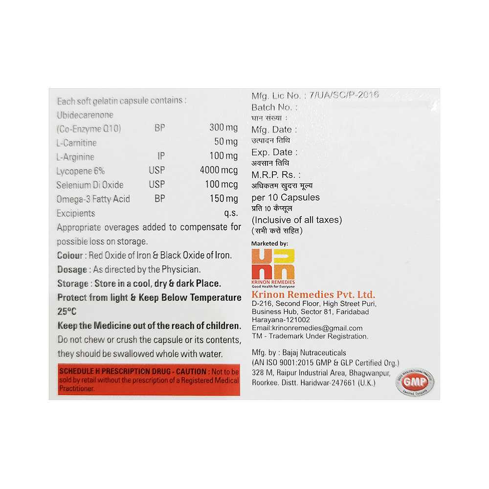 Salt Composition: Coenzyme Q10 (100mg) + Levo-carnitine (50mg) + L-Arginine (100mg) + Lycopene (4000mcg) + Selenium (100mcg) + Omega-3 fatty acid (150mg)