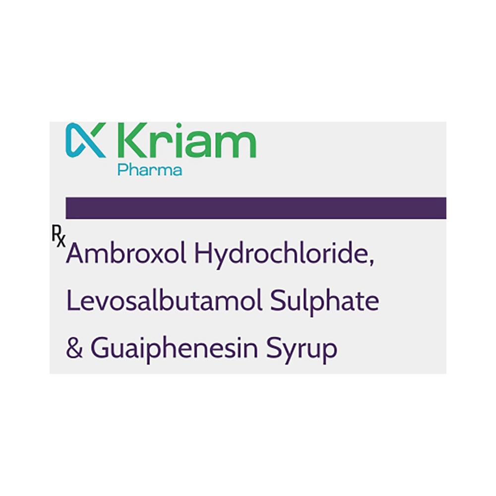Kriam Pharma Ambroxol Hydrochloride, Levosalbutamol Sulphate & Guaiphenesin Syrup is a combination medicine used in the treatment of cough with mucus. It thins mucus in the nose, windpipe, and lungs, making it easier to cough out. It also provides relief from runny nose, sneezing, itching, and watery eyes. Kriam Pharma Ambroxol Hydrochloride, Levosalbutamol Sulphate & Guaiphenesin Syrup is taken with or without food in a dose and duration as advised by the doctor. The dose you are given will depend on your condition and how you respond to the medicine. You should keep taking this medicine for as long as your doctor recommends. If you stop treatment too early your symptoms may come back and your condition may worsen. Let your healthcare team know about all other medications you are taking as some may affect, or be affected by this medicine.The most common side effects are nausea, diarrhea, stomach pain, vomiting, muscle cramp, headache, skin rash, and increased heart rate. Most of these are temporary and usually resolve with time. Contact your doctor straight away if you are at all concerned about any of these side effects. This medicine can also cause sleepiness, so do not drive or do anything that requires mental focus until you know how this medicine affects you. Avoid drinking alcohol while taking this medicine as it can make sleepiness worse.Never support self-medication or recommend your medicine to another person. It is beneficial to have plenty of fluids while taking this medication. Before taking this medicine, you should tell your doctor if you are pregnant, planning pregnancy, or breastfeeding. You should also tell your doctor if you have any kidney or liver diseases so that your doctor can prescribe a suitable dose for you.