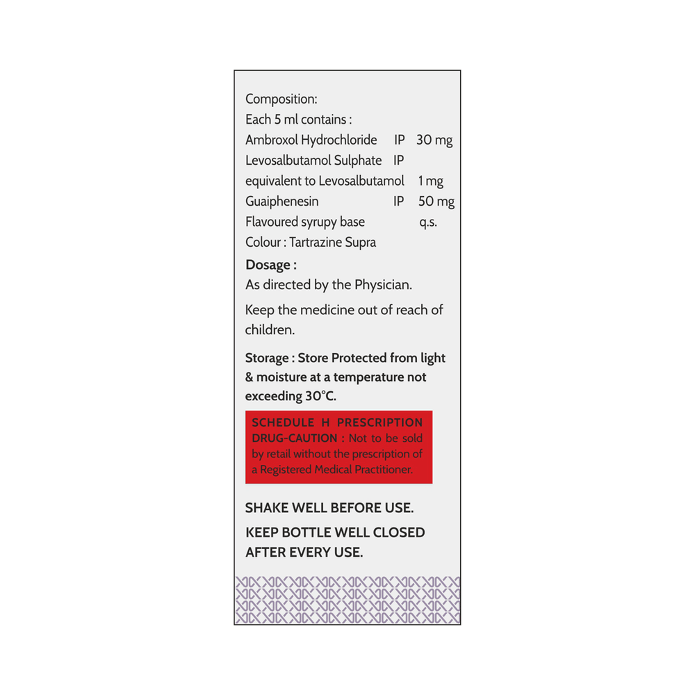 Salt Composition: Ambroxol (30mg/5ml) + Levosalbutamol (1mg/5ml) + Guaifenesin (50mg/5ml)