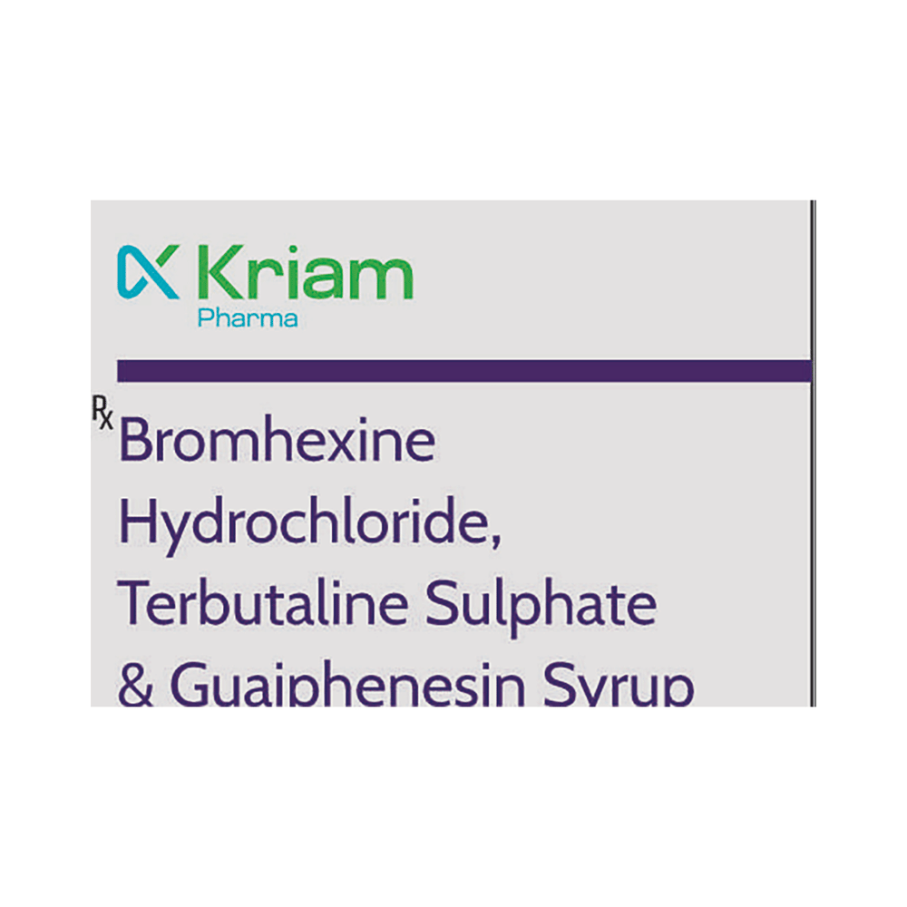Kriam Pharma Bromhexine,Terbutaline & Guaiphenesin Syrup is used in the treatment of cough with mucus. It thins mucus in the nose, windpipe, and lungs, making it easier to cough out. It also provides relief from a runny nose, sneezing, itching, and watery eyes. Kriam Pharma Bromhexine,Terbutaline & Guaiphenesin Syrup is taken with or without food in a dose and duration as advised by the doctor. The dose you are given will depend on your condition and how you respond to the medicine. You should keep taking this medicine for as long as your doctor recommends. If you stop treatment too early, your symptoms may come back, and your condition may worsen. Let your doctor know about all other medications you are taking, as some may affect or be affected by this medicine.The most common side effects are nausea, diarrhea, bloating, indigestion, vomiting, stomach pain, sweating, headache, skin rash, tremor, and increased heart rate. Most of these are temporary and usually resolve with time. Contact your doctor straightaway if you are at all concerned about any of these side effects. This medicine can also cause sleepiness, so do not drive or do anything that requires mental focus until you know how this medicine affects you. Avoid drinking alcohol while taking this medicine, as it can make sleepiness worse.Never support self-medication or recommend your medicine to another person. It is beneficial to have plenty of fluids while taking this medication. Before taking this medicine, you should tell your doctor if you are pregnant, planning pregnancy, or breastfeeding. You should also tell your doctor if you have any kidney or liver diseases so that your doctor can prescribe a suitable dose for you.