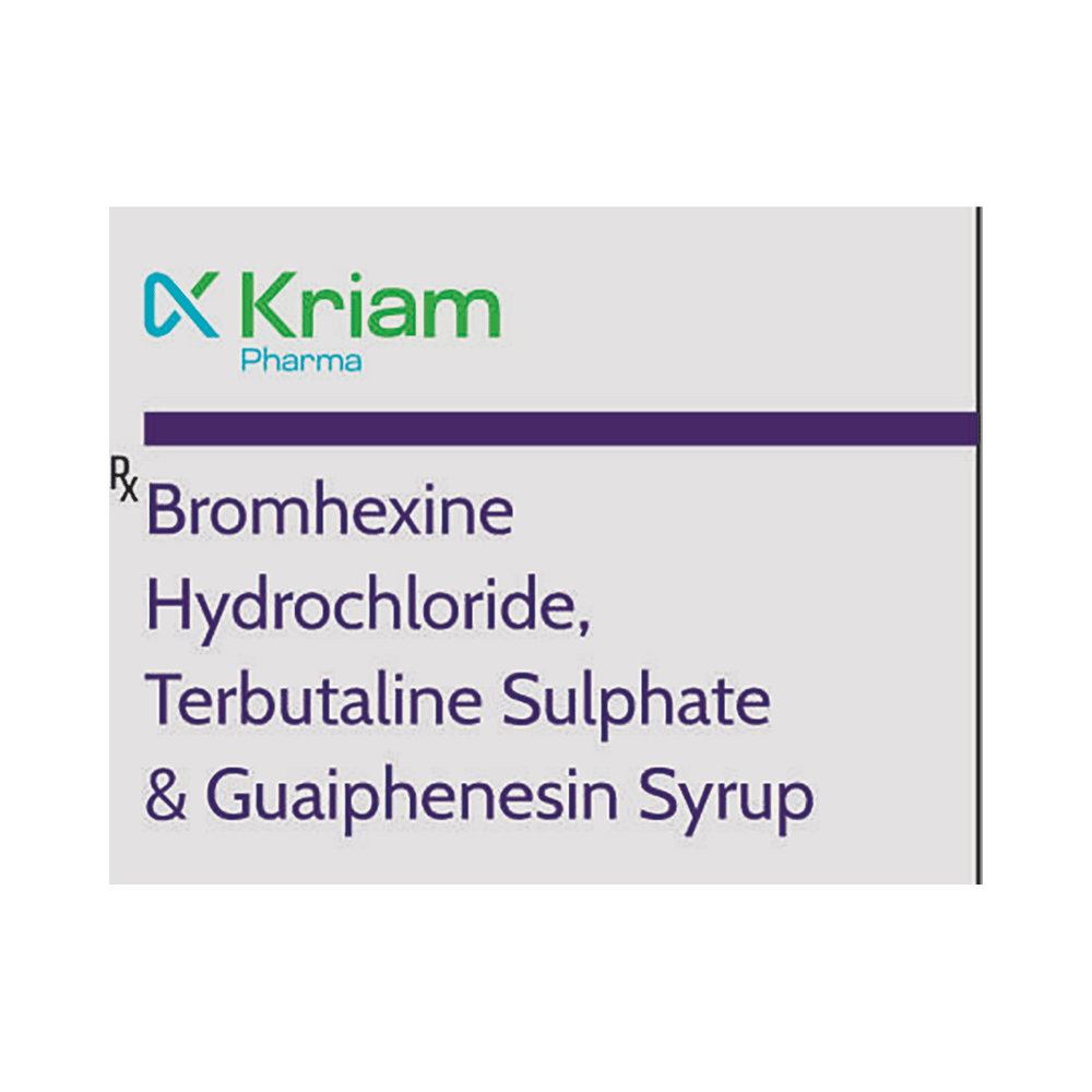 Kriam Pharma Bromhexine,Terbutaline & Guaiphenesin Syrup is used in the treatment of cough with mucus. It thins mucus in the nose, windpipe, and lungs, making it easier to cough out. It also provides relief from a runny nose, sneezing, itching, and watery eyes. Kriam Pharma Bromhexine,Terbutaline & Guaiphenesin Syrup is taken with or without food in a dose and duration as advised by the doctor. The dose you are given will depend on your condition and how you respond to the medicine. You should keep taking this medicine for as long as your doctor recommends. If you stop treatment too early, your symptoms may come back, and your condition may worsen. Let your doctor know about all other medications you are taking, as some may affect or be affected by this medicine.The most common side effects are nausea, diarrhea, bloating, indigestion, vomiting, stomach pain, sweating, headache, skin rash, tremor, and increased heart rate. Most of these are temporary and usually resolve with time. Contact your doctor straightaway if you are at all concerned about any of these side effects. This medicine can also cause sleepiness, so do not drive or do anything that requires mental focus until you know how this medicine affects you. Avoid drinking alcohol while taking this medicine, as it can make sleepiness worse.Never support self-medication or recommend your medicine to another person. It is beneficial to have plenty of fluids while taking this medication. Before taking this medicine, you should tell your doctor if you are pregnant, planning pregnancy, or breastfeeding. You should also tell your doctor if you have any kidney or liver diseases so that your doctor can prescribe a suitable dose for you.