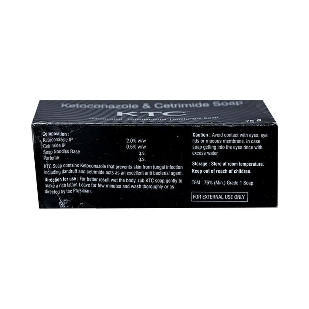 KTC Soap is a prescription medicine having a combination of medicines that are used to treat dandruff. It kills the microorganisms causing dandruff and provides relief from itchy and flaky scalp. KTC Soap should be used in the dose and duration as advised by your doctor. Wash your hands before using this medicine. It is advised to check the label for directions before use. It is for external use only.Do not use this medicine more than the recommended dose. Inform your doctor if you have known allergies from this medicine. The common side effects of this medicine include burning, itching, irritation and redness at the application site.If these side effects or any other symptoms which you think are because of this medicine persist for a longer duration, please consult your doctor. Inform your doctor if you are pregnant or breastfeeding or are suffering from any other disease.