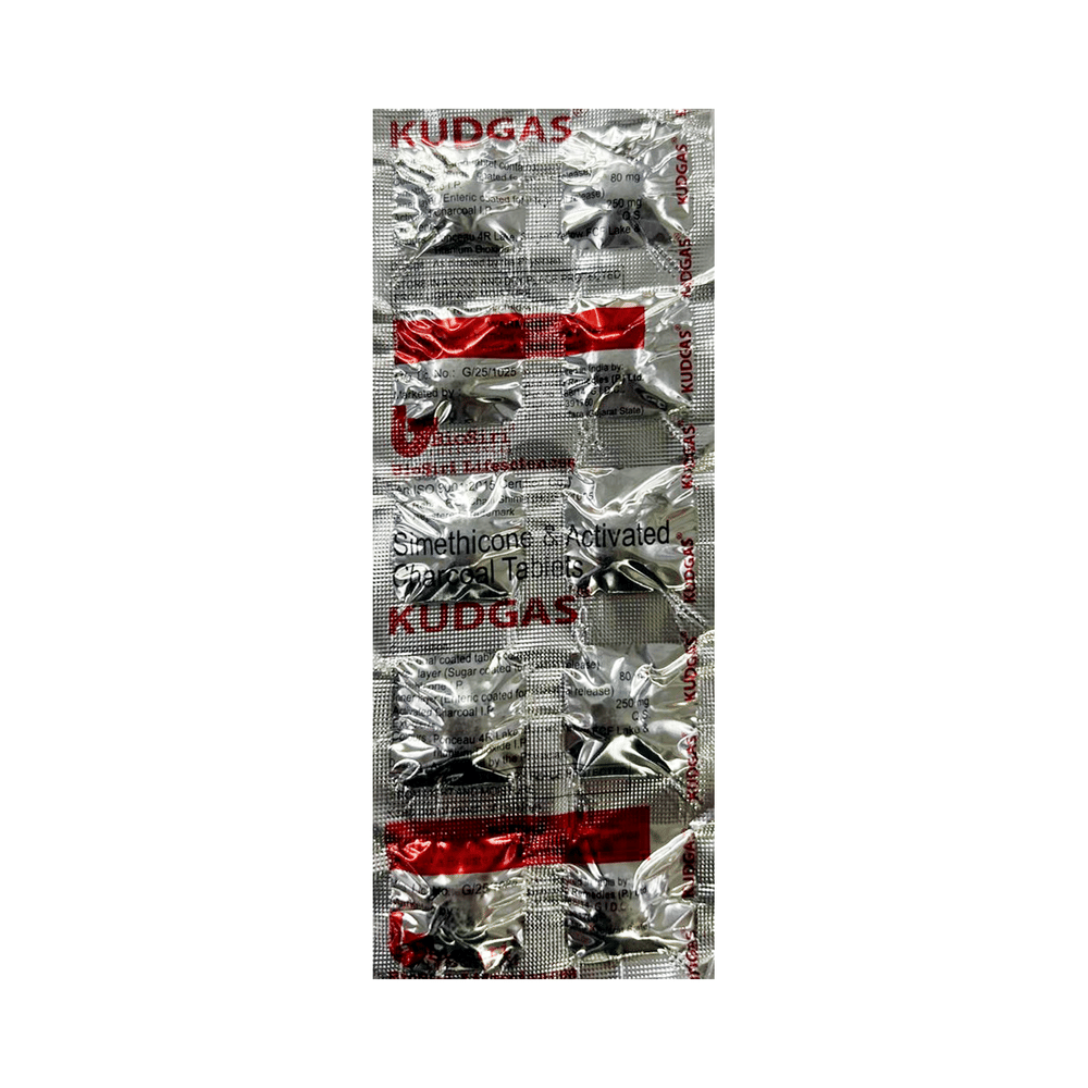 Kudgas Tablet is used in the treatment of flatulence. It relieves discomfort and pain caused by excessive gas in the stomach and intestines in conditions like postoperative gaseous distention. This medicine is taken with meals preferably at bedtime in a dose and duration advised by the doctor. If you stop the treatment too early, your symptoms may come back and the condition may worsen. Let your doctor know about all other medications that you are taking as some may affect, or be affected by this medicine.Kudgas Tablet is generally safe with no common side effects. However, it may cause diarrhea, nausea, vomiting, etc. in some people. Before taking this medicine, let the doctor know if you have kidney problems. Pregnant and breastfeeding women should also consult their doctors before taking this medicine.
