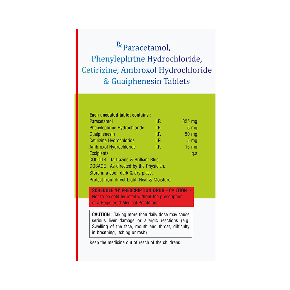 Salt Composition: Ambroxol (15mg) + Guaifenesin (50mg) + Phenylephrine (5mg) + Paracetamol (325mg) + Cetirizine (5mg)