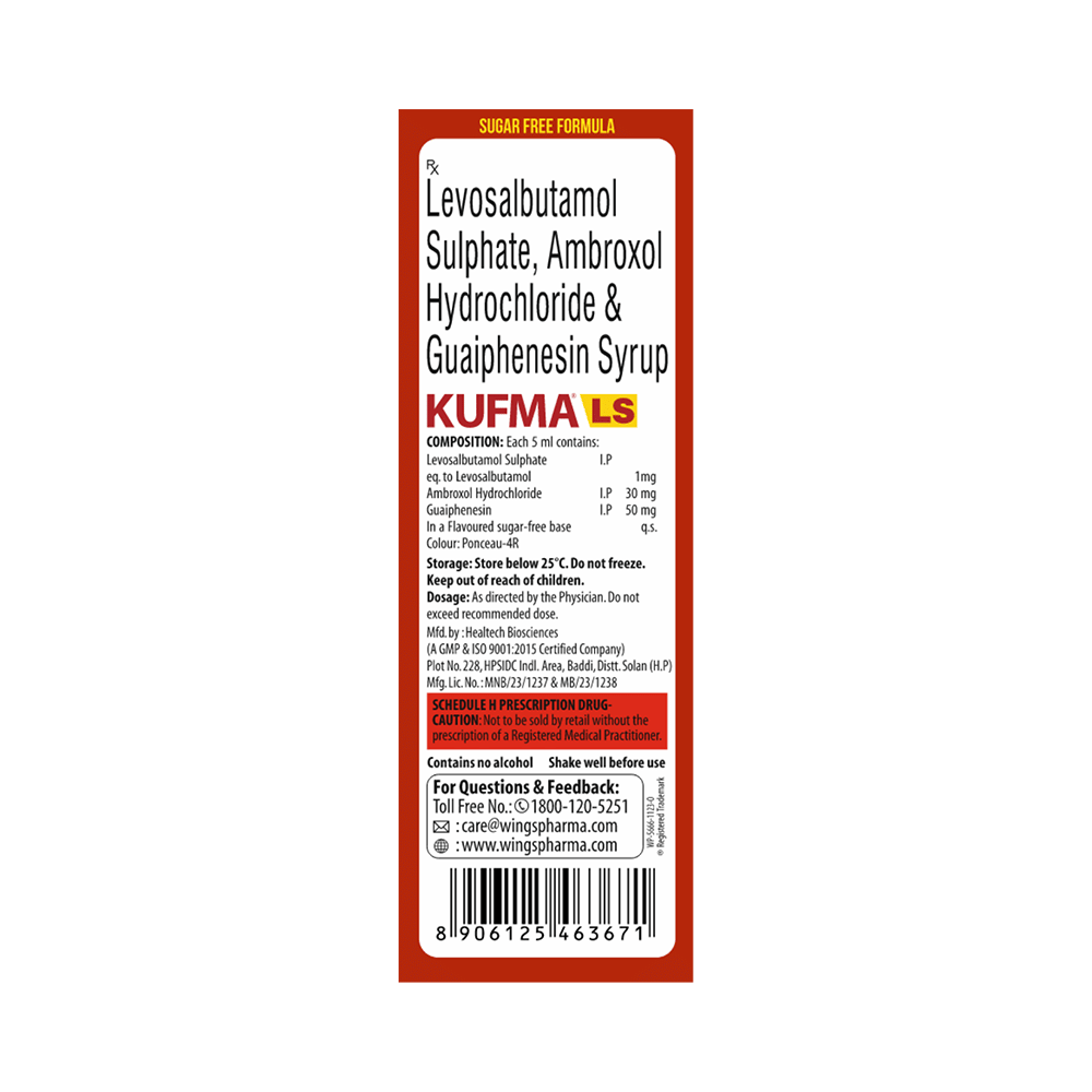 Kufma LS Cough Syrup Wet Cough Relief Litchi Sugar Free is a combination medicine used in the treatment of cough with mucus. It thins mucus in the nose, windpipe, and lungs, making it easier to cough out. It also provides relief from runny nose, sneezing, itching, and watery eyes. Kufma LS Cough Syrup Wet Cough Relief Litchi Sugar Free is taken with or without food in a dose and duration as advised by the doctor. The dose you are given will depend on your condition and how you respond to the medicine. You should keep taking this medicine for as long as your doctor recommends. If you stop treatment too early your symptoms may come back and your condition may worsen. Let your healthcare team know about all other medications you are taking as some may affect, or be affected by this medicine.The most common side effects are nausea, diarrhea, stomach pain, vomiting, muscle cramp, headache, skin rash, and increased heart rate. Most of these are temporary and usually resolve with time. Contact your doctor straight away if you are at all concerned about any of these side effects. This medicine can also cause sleepiness, so do not drive or do anything that requires mental focus until you know how this medicine affects you. Avoid drinking alcohol while taking this medicine as it can make sleepiness worse.Never support self-medication or recommend your medicine to another person. It is beneficial to have plenty of fluids while taking this medication. Before taking this medicine, you should tell your doctor if you are pregnant, planning pregnancy, or breastfeeding. You should also tell your doctor if you have any kidney or liver diseases so that your doctor can prescribe a suitable dose for you.