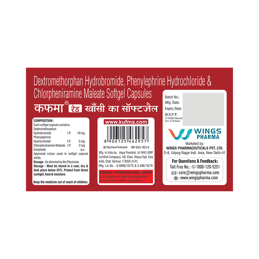 Kufma Red Cough Relief Softgels is a combination of three medicines: Phenylephrine, Chlorpheniramine Maleate, and Dextromethorphan Hydrobromide. Phenylephrine is a decongestant which narrows the small blood vessels providing relief from congestion or stuffiness in the nose. Chlorpheniramine Maleate is an antiallergic which relieves allergy symptoms like runny nose, watery eyes and sneezing. Dextromethorphan Hydrobromide is a cough suppressant which relieves cough by reducing the activity of cough center in the brain.
