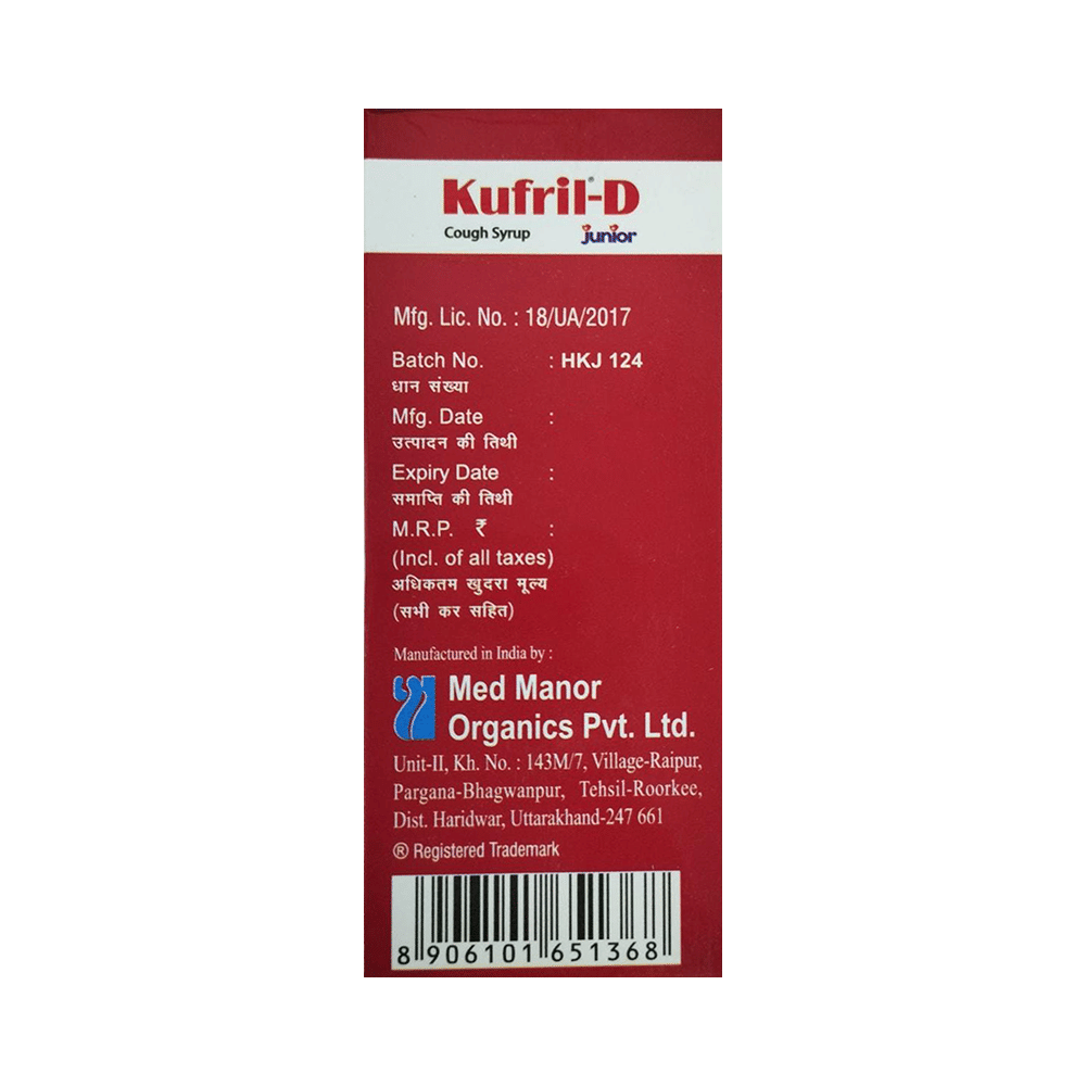 Kufril D Junior Syrup is a medicine used in the treatment of common cold and cough. It can provide quick relief from cough and common cold symptoms like runny nose, stuffy nose, sneezing, watery eyes, and congestion or stuffiness. Kufril D Junior Syrup is taken with or without food in a dose and duration as advised by the doctor. The dose you are given will depend on your condition and how you respond to the medicine. You should keep taking this medicine for as long as your doctor recommends. If you stop treatment too early your symptoms may come back and your condition may worsen. Let your healthcare team know about all other medications you are taking as some may affect, or be affected by this medicine.Common side effects of this medicine include headache, sedation, double vision, vomiting, diarrhea, dry mouth, and nausea. Most of these are temporary and usually resolve with time. Contact your doctor straight away if you are at all concerned about any of these side effects. This medicine can also cause sleepiness, so do not drive or do anything that requires mental focus until you know how this medicine affects you. Avoid drinking alcohol while taking this medicine as it can worsen your sleepiness.Never support self-medication or recommend your medicine to another person. It is beneficial to have plenty of fluids while taking this medication. Before taking this medicine, you should tell your doctor if you are pregnant, planning pregnancy or breastfeeding. You should also tell your doctor if you have any kidney or liver diseases so that your doctor can prescribe a suitable dose for you.