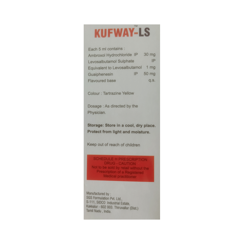 Kufway-LS Syrup Strawberry Sugar Free is a combination of three medicines: Levosalbutamol, Ambroxol and Guaifenesin which relieve cough with mucus. Levosalbutamol is a bronchodilator. It works by relaxing the muscles in the airways and widens airways. Ambroxol is a mucolytic which thins and loosens mucus (phlegm), making it easier to cough out. Guaifenesin is an expectorant which decreases the stickiness of mucus (phlegm) and helps in its removal from the airways.