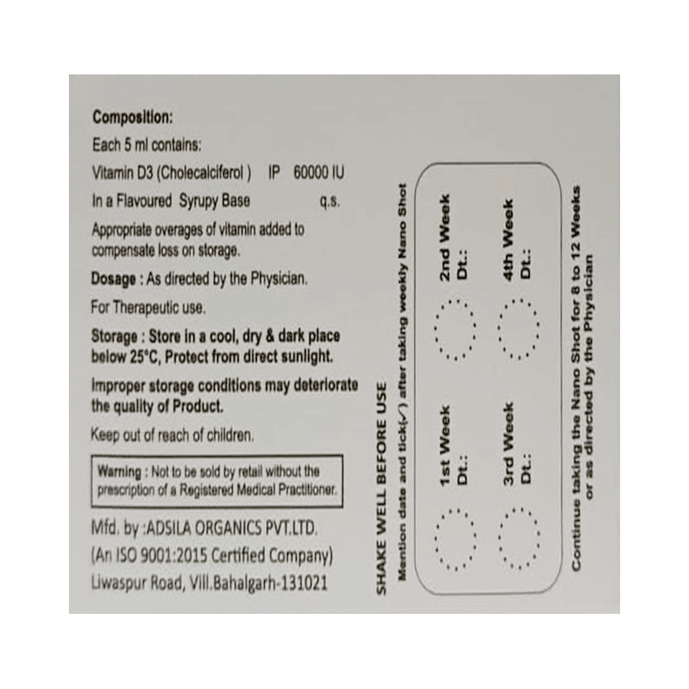 Kureferol 60K Nano Shot Butterscotch Sugar Free is used in the treatment of vitamin D deficiency and osteoporosis. It helps the body to absorb calcium. Calcium is essential for maintaining strong and healthy bones. It is used when your diet does not provide enough calcium. Kureferol 60K Nano Shot Butterscotch Sugar Free should be taken as directed by your doctor. It is best taken with or after food, as this helps your body absorb it, and you should take it regularly to get the most benefits. If you are using it to treat osteoporosis, you will also be prescribed other medicines. This medicine may be only part of a complete treatment program that includes making changes to your diet and taking calcium and vitamin supplements. Learn about the foods you should eat to ensure you get enough calcium and vitamin D.Kureferol 60K Nano Shot Butterscotch Sugar Free has few side effects, and none are common. If you take too much, you may feel weakness, muscle pain, or a metallic taste in your mouth. If you experience any such side effects, speak with your doctor. They may be able to help you reduce or treat the symptoms.Before taking this medicine, tell your doctor if you have high calcium levels in your blood or if you have any heart, kidney, or liver disease. Some other medicines can decrease the absorption of vitamin D3, so let your doctor know about all the other medicines you are taking to make sure you are safe. This medicine may help during pregnancy when your body needs more vitamin D, but too much could harm your baby. Discuss it with your doctor.