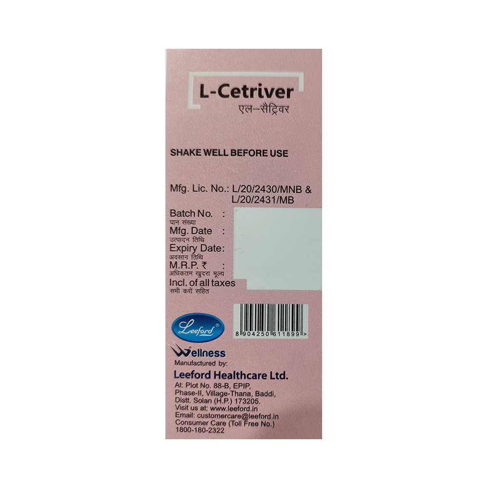L-Cetriver Syrup is given to children to treat a wide range of symptoms caused due to allergic conditions like hay fever, urticaria (hives), conjunctivitis (red, itchy eye), and common cold. These symptoms may include watery eyes, runny nose, sneezing, and itching. L-Cetriver Syrup can be taken with or without food. The dose required by you may vary depending on what you are taking it for. This medicine is usually taken in the evening, but follow the advice of your doctor on how to take it. You may need this medicine only on days you have symptoms, but if you are taking it to prevent the symptoms then you should take it regularly. If you miss doses or stop taking it earlier than advised, your symptoms may come back.This medicine is generally very safe. The most common side effects include feeling sleepy or dizzy, dry mouth, fatigue, and headache. These are usually mild and go away after a couple of days as your body adjusts to it. Consult your doctor if any of the side effects persist or worry you.Before taking it, tell your doctor if you have any kidney problems or epilepsy (seizures). Your dose may need to be modified or this medicine may not suit you. Some other medicines can interact with this medicine so let your healthcare team know what else you are taking. You should also talk to your doctor before using this medicine if you are pregnant or breastfeeding, although it is not thought to be harmful.