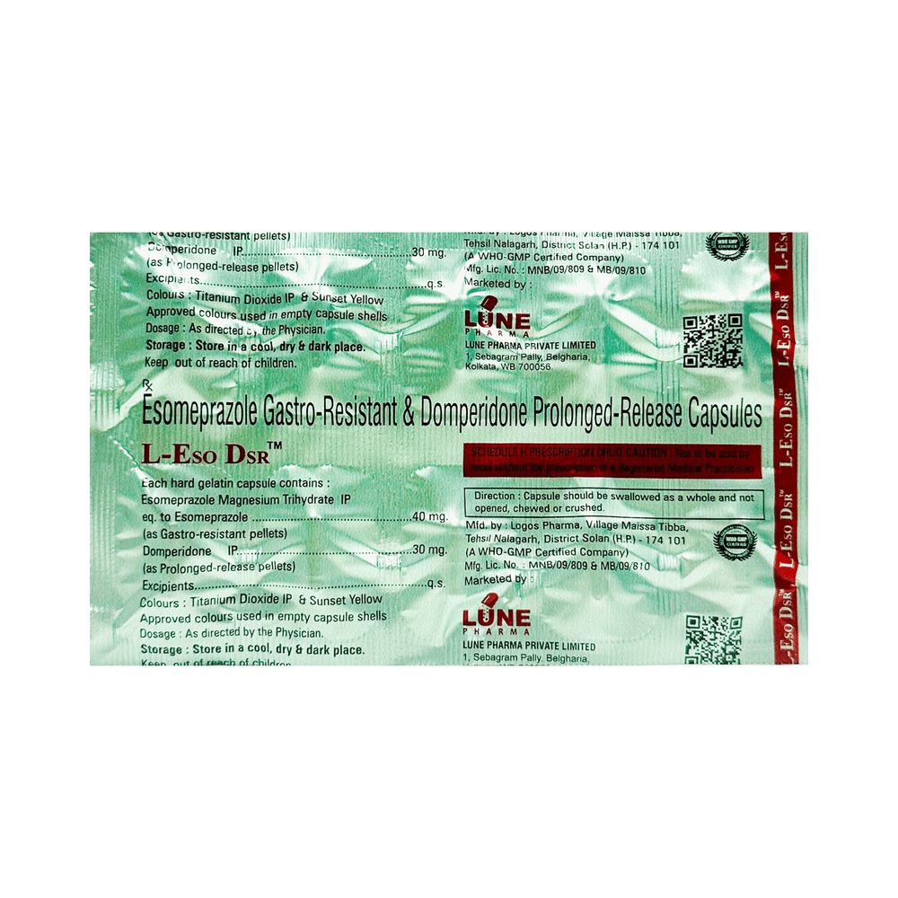 L-Eso DSR Capsule is a prescription medicine used to treat gastroesophageal reflux disease (acid reflux). It helps relieve symptoms such as heartburn, stomach pain, or irritation. It also neutralizes the acid in the stomach and promotes easy gas passage to reduce stomach discomfort. L-Eso DSR Capsule is best taken on an empty stomach. Take it in the dose and duration advised by the doctor. Continue taking this medicine for as long as your doctor recommends. If you stop treatment too early, your symptoms may come back, and your condition may worsen. Let your doctor know about all other medications you are taking, as some may affect, or be affected by, this medicine.The most common side effects of L-Eso DSR Capsule include diarrhea, flatulence, stomach pain, dryness in the mouth, and headache. Most of these are temporary and usually resolve with time. Contact your doctor straight away if you are at all concerned about any side effects. It may also cause sleepiness and dizziness, so do not drive or do anything that requires mental focus until you know how this medicine affects you.Before taking this medicine, you should tell your doctor if you are pregnant, planning pregnancy, or breastfeeding. You should also tell your doctor if you have severe liver disease so that your doctor can prescribe a suitable dose for you. Lifestyle modifications like having cold milk and avoiding hot tea, coffee, spicy food, or chocolate can help you get better results.