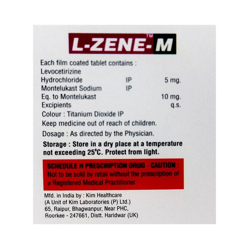 L-Zene-M Tablet is a combination of two medicines: Levocetirizine and Montelukast, which relieves sneezing and runny nose due to allergies. Levocetirizine is an antiallergic which blocks a chemical messenger (histamine) responsible for runny nose, watery eyes and sneezing. Montelukast is a leukotriene antagonist. It works by blocking another chemical messenger (leukotriene). This reduces inflammation (swelling) in the airways and nose, and improves symptoms.