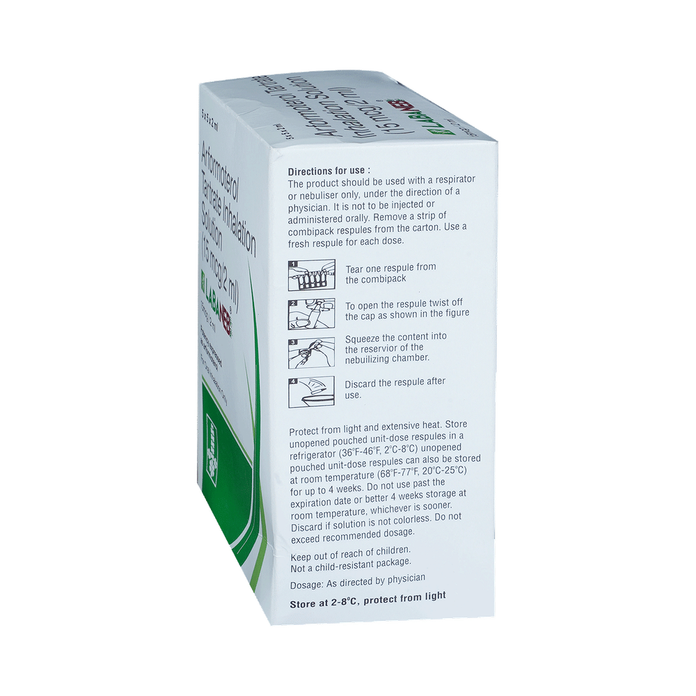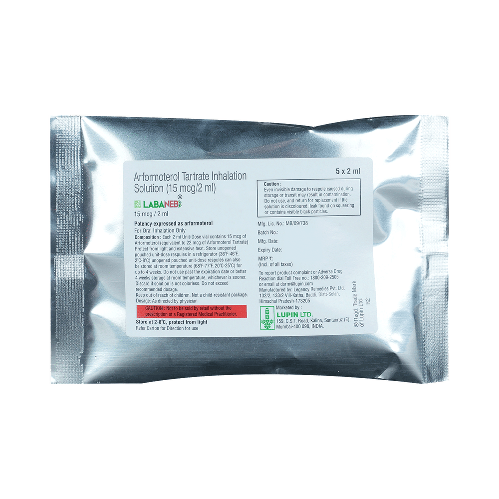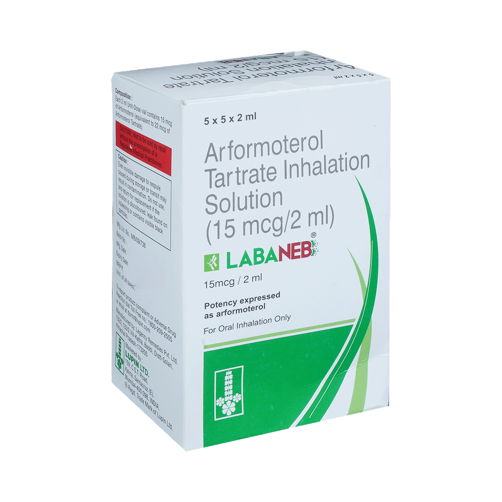 Labaneb Respules (2ml Each) is used in the treatment of chronic obstructive pulmonary disorder (COPD), a lung disorder in which the flow of air to the lung is blocked. It provides relief from COPD symptoms like wheezing, shortness of breath, coughing, and chest tightness. This medicine is for inhalation purposes only. Thus, it should not be taken by mouth. It is important to follow all the guidelines of the doctor before using it. Before using the medicine, inform your doctor if you are suffering from any heart disease. Common side effects of this medicine include pain, chest pain, back pain, diarrhea, sinus infection, leg cramps, breathlessness, rash, flu-like symptoms, peripheral edema, and lung disorder. If any of these side effects persist or get worse, you should let your doctor know.You should never use this medicine to relieve symptoms of asthma as it can be life-threatening. It may cause side effects like tremors, headaches, and insomnia (difficulty in sleeping).