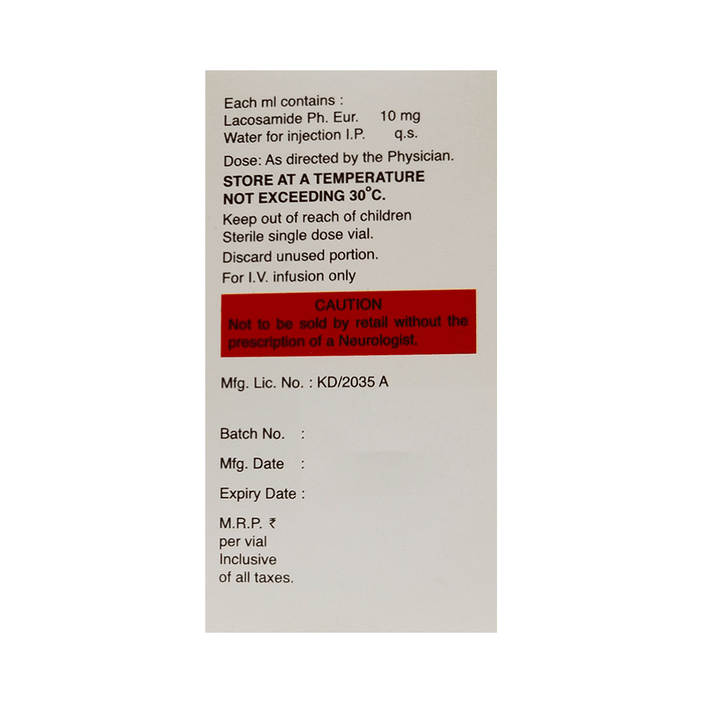 Lacosam Injection is use to control and prevent epilepsy (seizures). It is used alone or in combination with other similar medicines and it controls seizures by decreasing the abnormal and excessive activity of the nerve cells in the brain. Lacosam Injection is given under the supervision of a doctor or a nurse. It should not be self-administered at home. Get the injection regularly and at the same time each day to get maximum benefits. If you have missed a dose, take it as soon as you remember as it can be life-threatening in some cases, so it is better to keep an extra stock always to avoid a missed dose. You should finish the full course of treatment even if you feel better and always consult your doctor before stopping this medicine as it may increase seizure frequency. Inform your doctor if you have any heart-related problems, before starting your treatment with this medicine.The use of this medicine may cause some common side effects like headaches, dizziness, blurred vision, nausea, and diplopia (double vision). Most of these side effects are self-limiting and they usually improve with time. Additionally, you may notice some injection site reactions like redness or swelling. Please consult your doctor if these side effects do not resolve or persist for a longer duration.