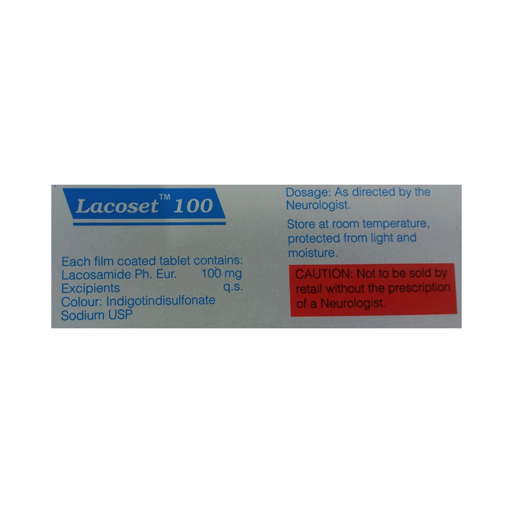 Lacoset 100 Tablet is used to control and prevent epilepsy (seizures). It controls seizures or fits by decreasing the abnormal and excessive activity of the nerve cells in the brain. Lacoset 100 Tablet may be taken with or without food, preferably at the same time, each day. If you have missed a dose, take it as soon as you remember as it can be life-threatening in some cases, so it is better to keep an extra stock always to avoid a missed dose. You should finish the full course of treatment even if you feel better and always consult your doctor before stopping this medicine as it may increase seizure frequency. Inform your doctor if you have any heart-related problems, before starting your treatment with this medicine.The use of this medicine may cause some side effects such as headaches, dizziness, dry mouth, muscle spasms, blurred vision, nausea, diplopia (double vision). Most of these side effects are self-limiting and they usually improve with time. Keep a watch on your weight, as using this medicine can cause weight gain. Eat healthily and exercise regularly to manage it.