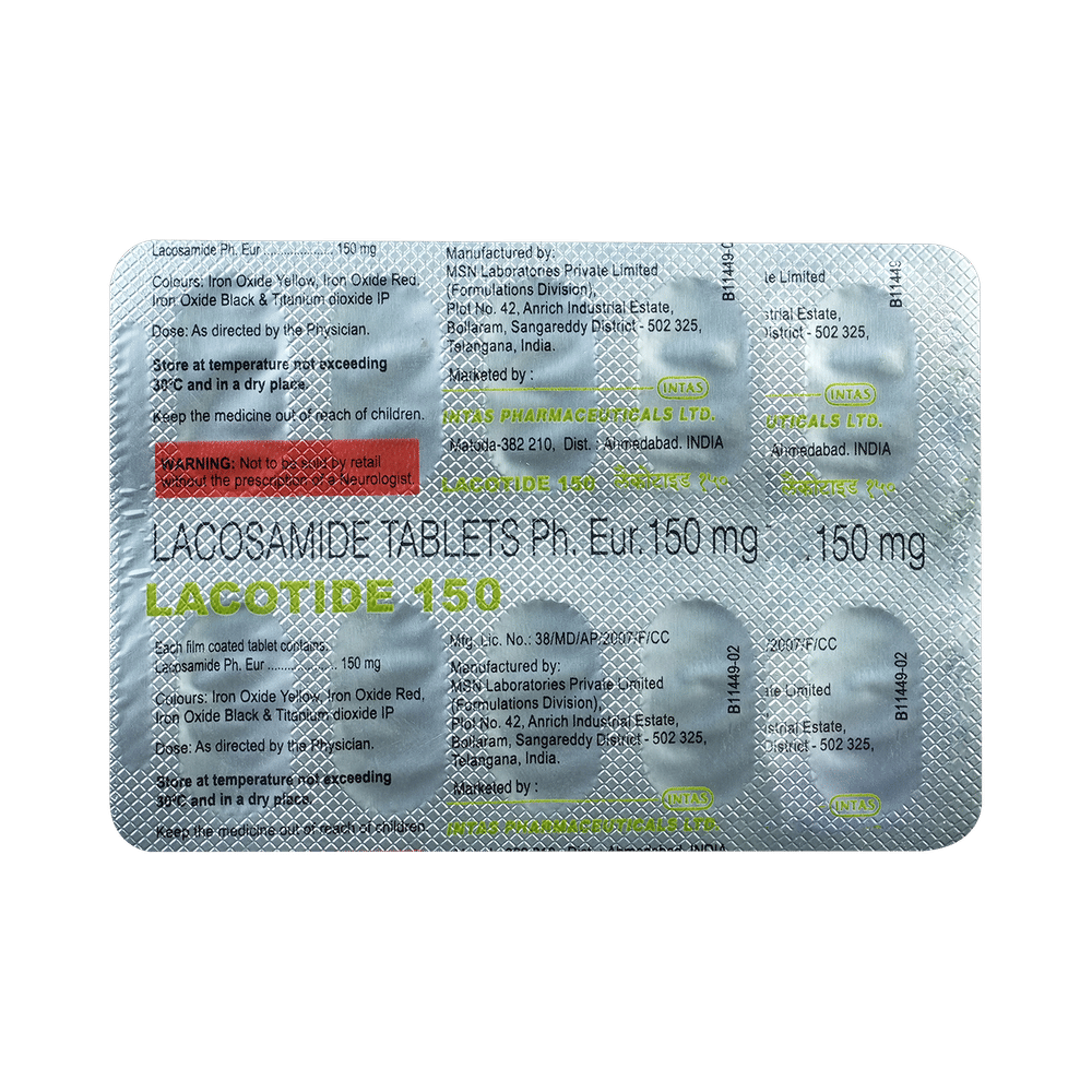 Lacotide 150mg Tablet is used to control and prevent epilepsy (seizures). It controls seizures or fits by decreasing the abnormal and excessive activity of the nerve cells in the brain. Lacotide 150mg Tablet may be taken with or without food, preferably at the same time, each day. If you have missed a dose, take it as soon as you remember as it can be life-threatening in some cases, so it is better to keep an extra stock always to avoid a missed dose. You should finish the full course of treatment even if you feel better and always consult your doctor before stopping this medicine as it may increase seizure frequency. Inform your doctor if you have any heart-related problems, before starting your treatment with this medicine.The use of this medicine may cause some side effects such as headaches, dizziness, dry mouth, muscle spasms, blurred vision, nausea, diplopia (double vision). Most of these side effects are self-limiting and they usually improve with time. Keep a watch on your weight, as using this medicine can cause weight gain. Eat healthily and exercise regularly to manage it.