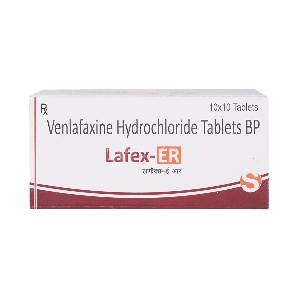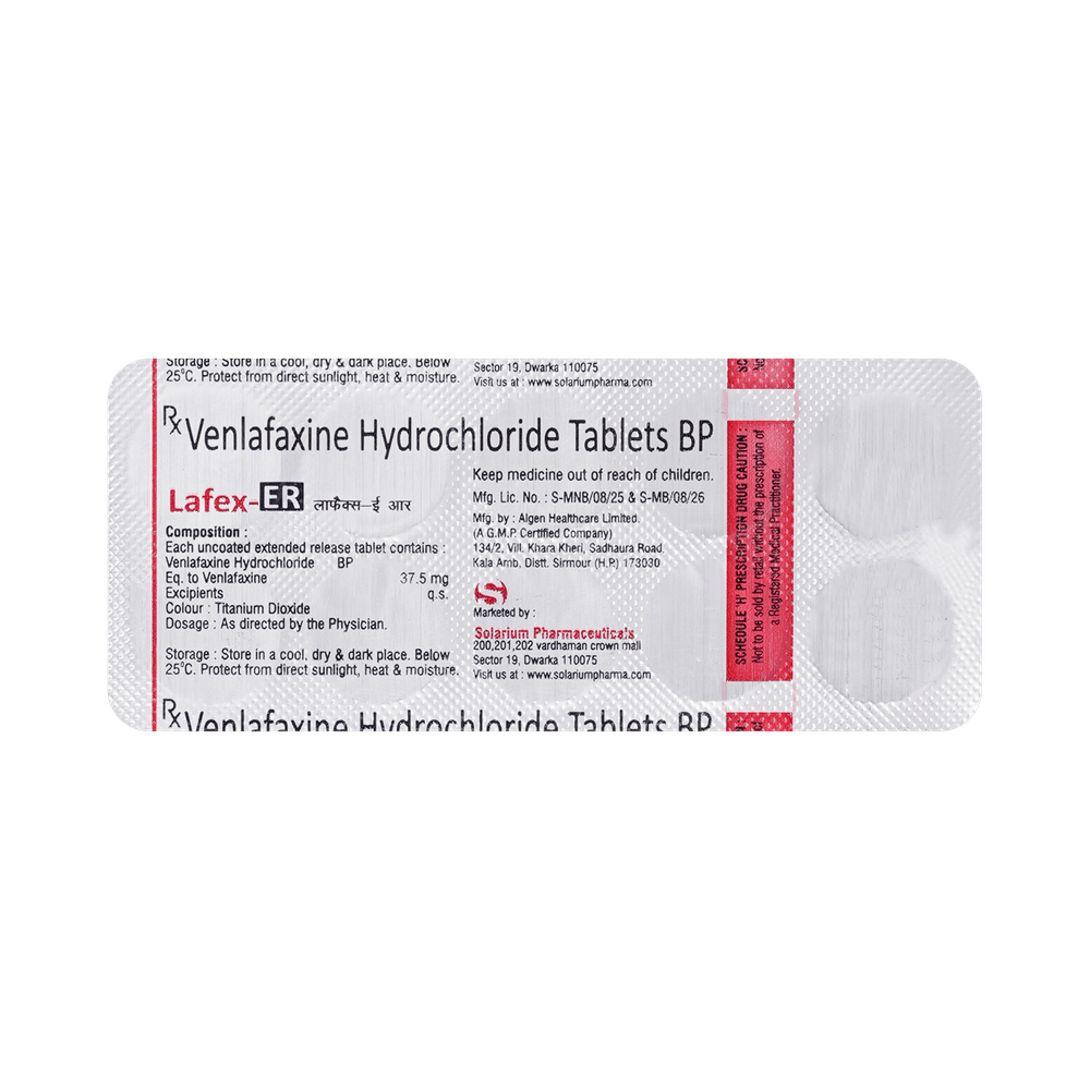 Lafex 37.5mg Tablet ER is a medicine used to treat major depressive disorder and anxiety disorders. It helps improve mood, reduce nervousness, and improve overall well-being by restoring the balance of certain brain chemicals that affect mood and emotions. Lafex 37.5mg Tablet ER should be taken with food. Take this medicine at the same time each day to maintain a stable level in your blood. If you miss a dose, take it as soon as you remember. Do not skip doses, and complete the full course of treatment even if you feel better. Do not stop taking this medication abruptly, as it may worsen your symptoms.Some common side effects of this medicine include nausea, insomnia (difficulty sleeping), constipation, increased sweating, and sexual dysfunction. However, these side effects are temporary and typically resolve on their own over time. Consult your doctor if these do not subside or bother you.Lafex 37.5mg Tablet ER may cause dizziness and drowsiness, so avoid driving or engaging in activities that require mental focus until you understand how this medicine affects you. Before taking Lafex 37.5mg Tablet ER, inform your doctor if you have any kidney, heart, or liver conditions or a history of seizures (epilepsy or fits). Additionally, notify your doctor if you experience any unusual mood or behavioral changes, worsening depression, or suicidal thoughts. Pregnant and breastfeeding women should consult before taking this medicine, as it may cause harmful effects on the developing baby.