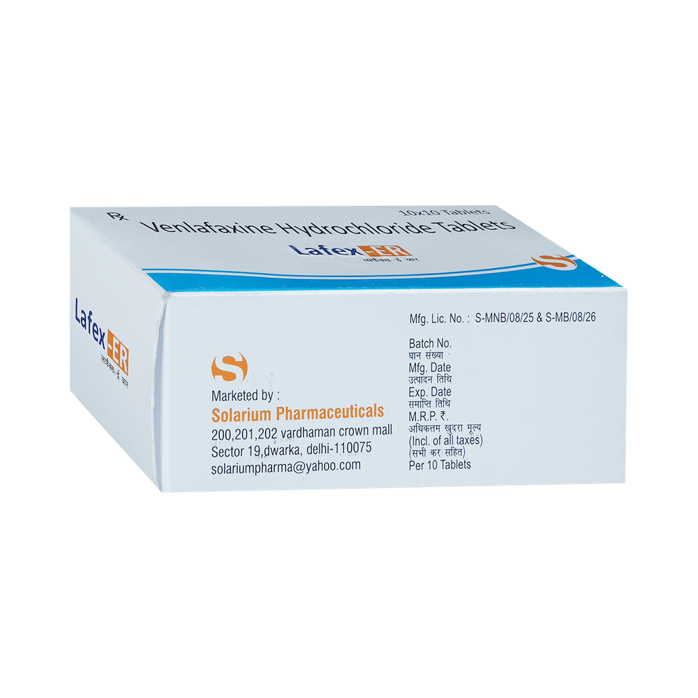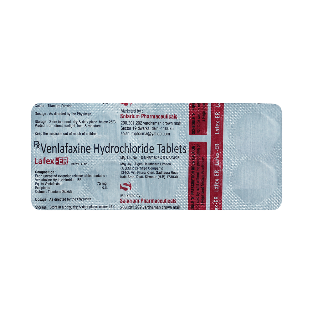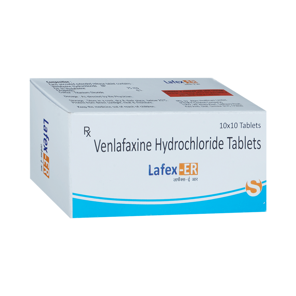 Lafex 75mg Tablet ER is a medicine used to treat major depressive disorder and anxiety disorders. It helps improve mood, reduce nervousness, and improve overall well-being by restoring the balance of certain brain chemicals that affect mood and emotions. Lafex 75mg Tablet ER should be taken with food. Take this medicine at the same time each day to maintain a stable level in your blood. If you miss a dose, take it as soon as you remember. Do not skip doses, and complete the full course of treatment even if you feel better. Do not stop taking this medication abruptly, as it may worsen your symptoms.Some common side effects of this medicine include nausea, insomnia (difficulty sleeping), constipation, increased sweating, and sexual dysfunction. However, these side effects are temporary and typically resolve on their own over time. Consult your doctor if these do not subside or bother you.Lafex 75mg Tablet ER may cause dizziness and drowsiness, so avoid driving or engaging in activities that require mental focus until you understand how this medicine affects you. Before taking Lafex 75mg Tablet ER, inform your doctor if you have any kidney, heart, or liver conditions or a history of seizures (epilepsy or fits). Additionally, notify your doctor if you experience any unusual mood or behavioral changes, worsening depression, or suicidal thoughts. Pregnant and breastfeeding women should consult before taking this medicine, as it may cause harmful effects on the developing baby.
